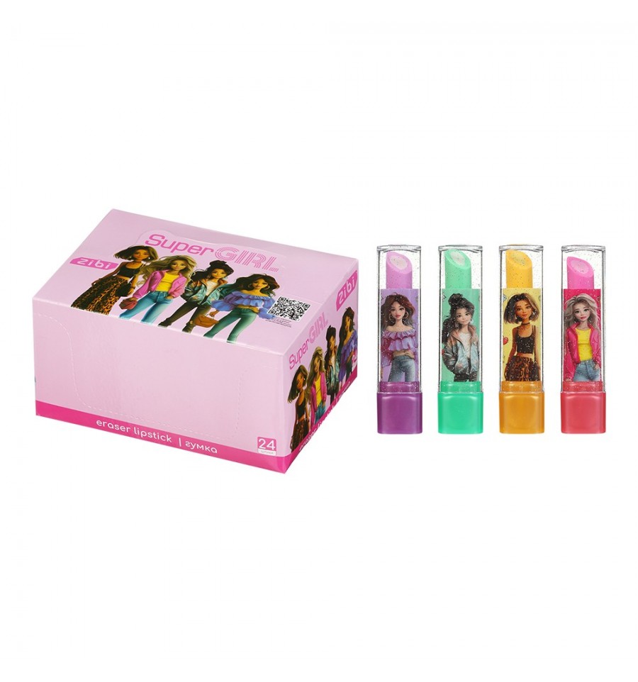 Гумка "Помада" серії SUPER GIRL від ZiВi – призначена для видалення написів графітових олівців, є не тільки інструментом для стирання, але також оригінальним стильним аксесуаром. Підходить для використання у навчанні, роботі та творчості, стане чудовою прикрасою робочої зони завдяки своєму цікавому дизайну. Невеликий розмір гумки дозволить покласти її в пенал чи органайзер.Гумка вміщена в пластиковий тюбик з кришечкою та механізмом викручування – виглядає як справжня помада! Завдяки корпусу Ваша гумка ніколи не забрудниться, довше буде м'яою та еластичною!Розмір гумки з тюбиком: 75х20х20 мм Матеріал гумки: синтетичний каучук Колір гумки асорті: рожевий, фіолетовий, зелений, жовтий Розрахована на стирання написів графітових олівців твердістю 2Н-НВ-2В Індивідуальна упаковка: пластиковий тюбик у формі помади Групова упаковка: картонний шоу-бокс містить 24 гумки в 4 дизайнах асорті