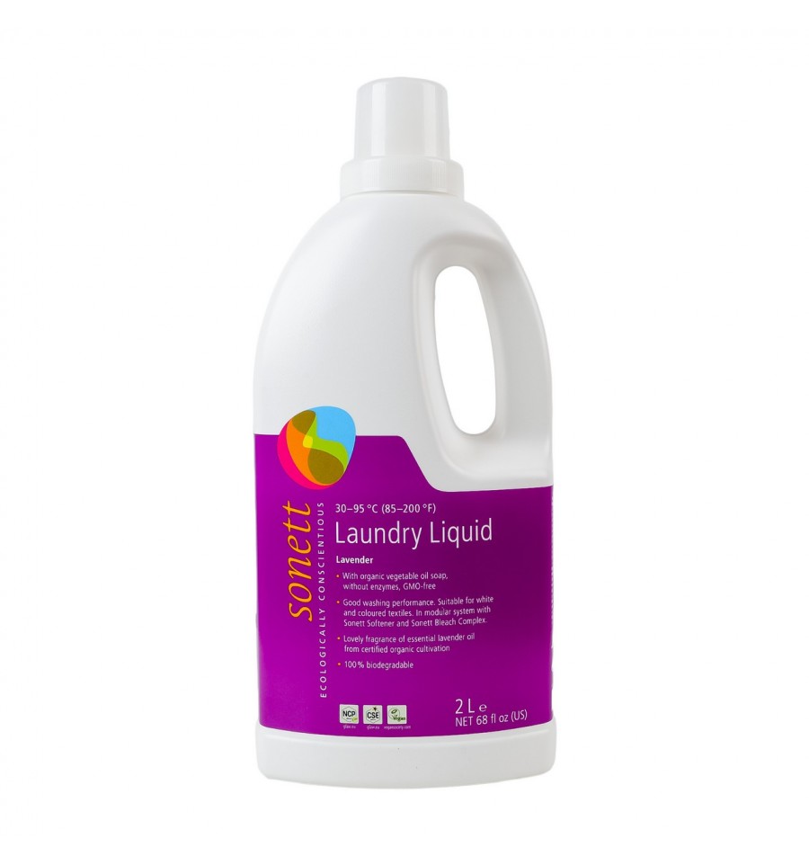 Рідина для прання Sonett Lavender 2л. Склад: 5-15% мило з ріпакової олії */соняшникова олія *; 5-15% неіонні ПАР (цукру); 5-15% аніонні ПАР (сульфат спирту виробляється з кокосового масла); 1-5% спирт етиловий - сільськогосподарської сировини (етанол); <1% аніонні ПАР (сульфат касторової олії), цитрат, натуральна ефірна олія лаванди * (містить ліналул *), гур`юнський бальзам; бальзамічні домішки *; структурована вода.Сертифіковане. органічне вирощування/збір дикоростущих трав. «Не підходить для вовни та шовку». Термін придатності - 3 роки. Зберігати в сухому, захищеному від прямих сонячних променів місці при температурі від 0 до 25°С. Виробник: Сонетт GmbH, Містельвег 1/Цігельайвег 5, D 88693 Деггенхаузен, (Німеччина) www.sonett.eu. Ексклюзивний імпортер та підприємство, що здійснює функції щодо прийняття претензій від споживача: ТОВ «Юнімед Органік», 01042, Україна, м. Київ, Печерський район, бульвар Дружби Народів, будинок 7, офіс 21 e-mail: info@junimed.ua, www.junimed.ua. Маса нетто: 2,0 л.