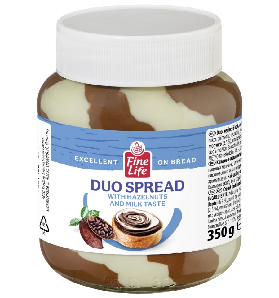 Fine Life Крем Дуо з какао-горіховим та молочним смаком 350г. Дата виробництва, дата "Краще спожити до": зазначені на кришці. Виробник: Wilhelm Reuss GmbH & Co. KG, Lebensmittelwerk, Sonnenallee 227, 12057 Berlin, Німеччина. Імпортер: ТОВ "МЕТРО Кеш енд Кері Україна". Адреса імпортера: 02140, Україна, м.Київ, просп.П.Григоренка, буд. 43 (www.metro.ua), З питань щодо продукту, гарантії та прийняття скарг звертайтесь до імпортера, тел. гарячої лінії 0800 501 401 (безкоштовно в межах України). Упаковано в Німеччині (ЄС).