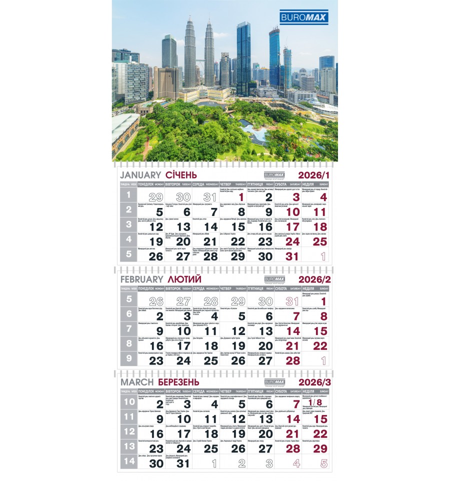 Календар BUROMAX на 2026 рік – незамінна річ, яка допоможе Вам легко спланувати свій місяць, квартал і рік.Зручний настінний квартальний календар на 3-х пружинах Три блоки, на кожному блоці один місяць, по 12 аркушів у кожному блоці Розмір виробу: 298х648мм Розмір постера: 298х210мм, виготовлений з целюлозного картону 300 г/м² Розмір блоків: 298х140мм, виготовлені з крейдованого паперу 90 г/м² Календарна сітка двома мовами: українською, англійською Комплектується покажчиком дати і отвором для кріплення Додаткова інформація: церковні, державні та професійні свята, вихідні дні