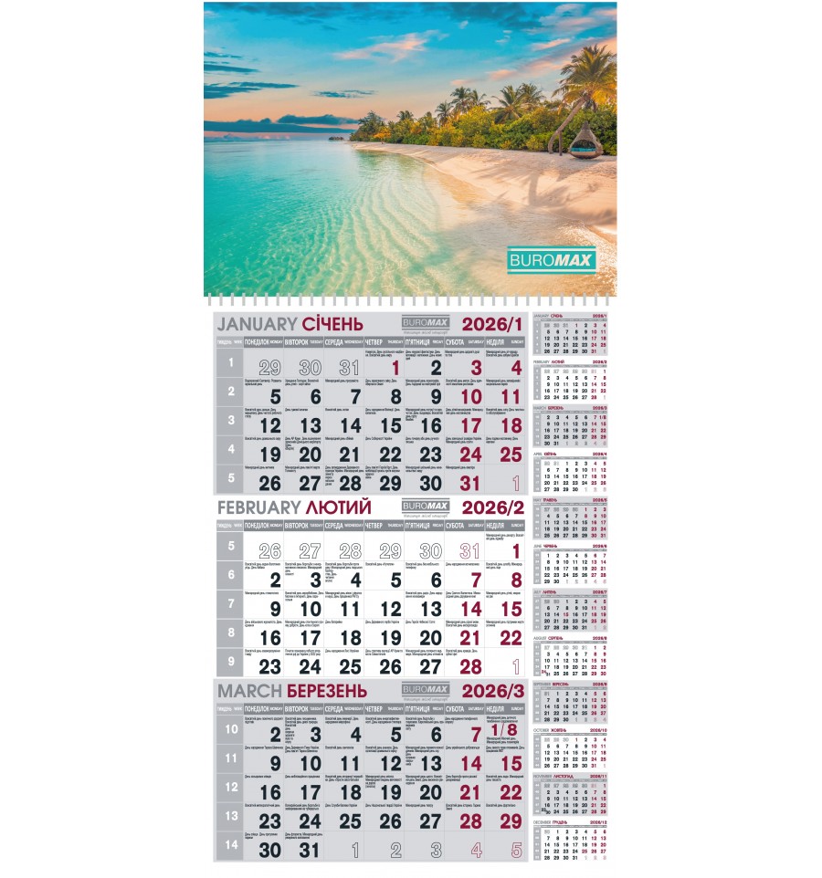 Календар BUROMAX на 2026 рік – незамінна річ, яка допоможе Вам легко спланувати свій місяць, квартал і рік.Зручний настінний квартальний календар на одній білій пружині 12 відривних аркушів з крейдованого паперу щільністю 90 г/м² розміром 298х420 мм На кожному аркуші три місяці детально: поточний, попередній та наступний та невеликий календар на рік Розмір виробу: 297х630 мм Розмір постера: 297х210 мм, виготовлений з целюлозного картону 300 г/м² Календарна сітка на двох мовах: українською, англійською Комплектується вказівником дати і отвором для кріплення Додаткова інформація: церковні, державні та професійні свята, вихідні дні