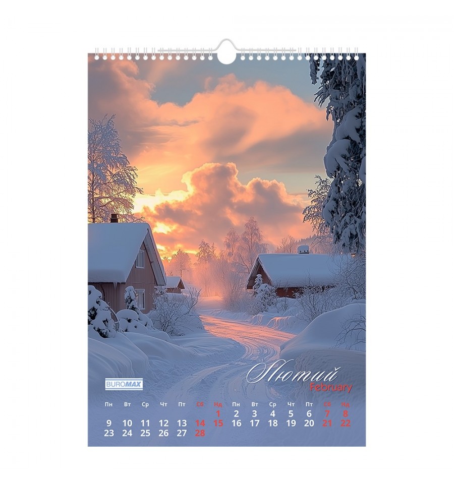 Календар настінний від BUROMAX - має дизайнерські постери та слугуватиме прекрасним доповненням інтер'єру.складається з 13 аркушів: перший аркуш - дизайнерський малюнок із зазначенням року, кожен наступний аркуш має дизайнерський малюнок та календар на 1 місяць року формат АЗ розташування вертикальне виготовлений з крейдованого паперу щільністю 200 г/м² скріплення: на металеву горизонтальну пружину білого кольору, яка має вигин для підвісу