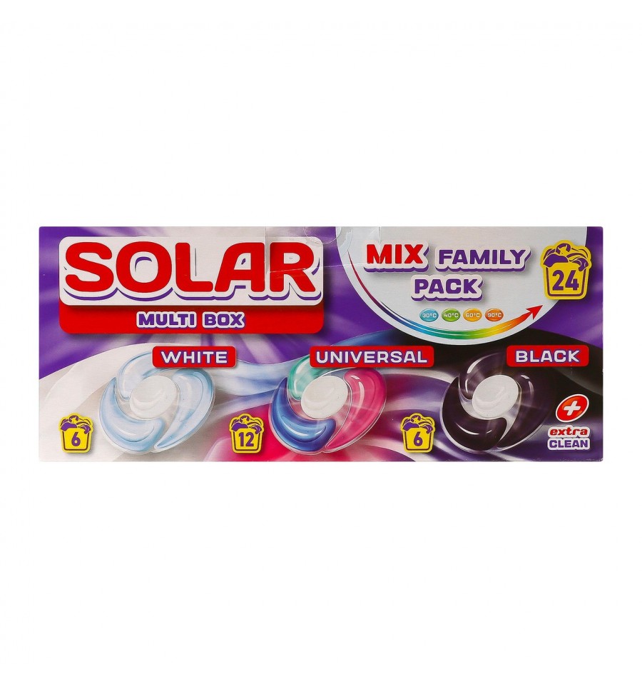Капсули для прання Solar Multi box для білих, універсальних та темних речей 24*20г/уп. Склад: капсули для прання білих речей: 15-30% аніонні ПАР, 15-30% неіоногенні ПАР, <5% мило, органічні наповнювачі, ензимний комплекс, парфумерна композиція, модифікований поліамін, оптичний відбілювач, консервант, барвник. Капсули для прання універсальні: 15-30% аніонні ПАР, 15-30% неіоногенні ПАР, <5% мило, органічні наповнювачі, ензими, ароматична композиція, консервант, барвник. Капсули для прання темних речей: 15-30% аніонні ПАР, 15-30% неіоногенні ПАР, <5% мило, органічні наповнювачі, ензимний комплекс, парфумерна композиція, модифікований поліамін, оптичний відбілювач, інгібітор переносу барвника, консервант, барвник. Рекомендовані способи застосування/вживання: покласти капсулу безпосередньо в барабан пральної машини перед завантаженням білизни. При виборі режиму і температури дотримуватись рекомендацій на ярликах одягу. Умови зберігання: зберігати за температури +5..+25ºC. Без потрапляння вологи і прямих сонячних променів. Застереження/міри безпеки: зберігати в недоступному для дітей місці, окремо від харчових продуктів. Уникати попадання у ротову порожнину та контакту з очима. Термін придатності: 24 місяці. Країна виробник: Україна. Виробник та адреса виробника: ТОВ Альфахімпро, вул. Промислова, буд. 1/26, м. Луцьк, Волинська обл., Україна, 43023. Кількість: 24шт. Маса нетто: 480г.