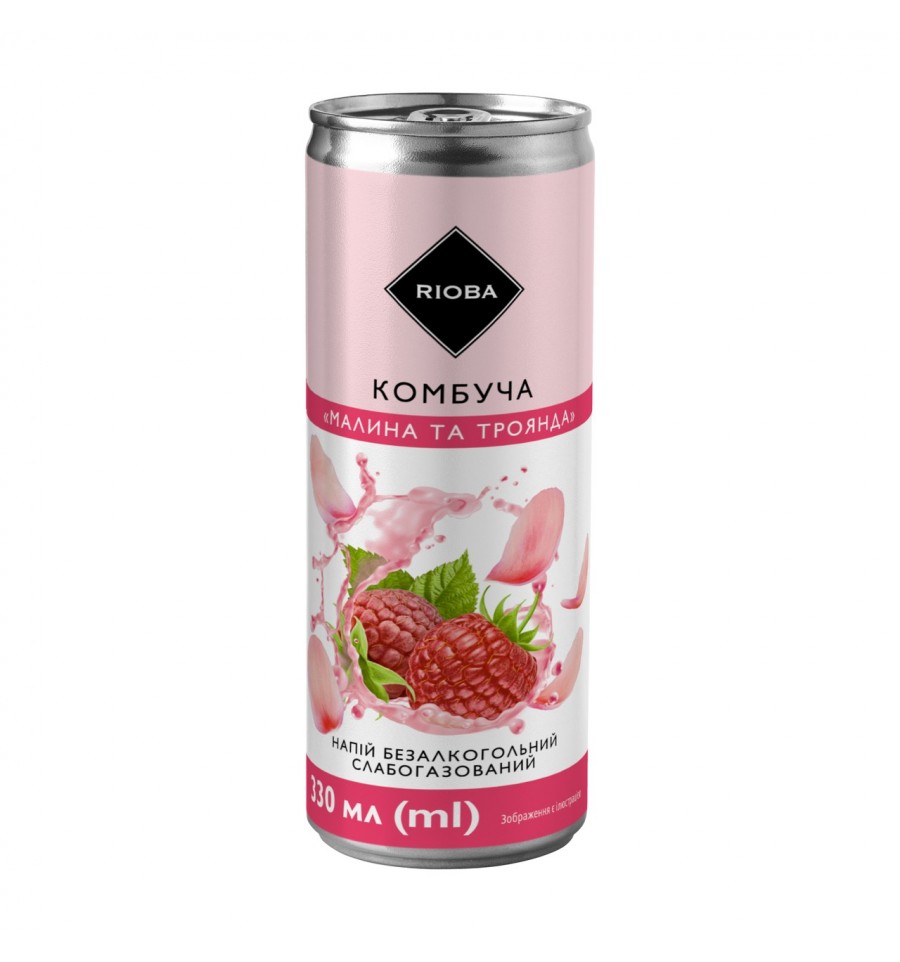 Напій безалкогольний слабогазований комбуча «Малина та троянда» ТМ «RIOBA» ТУ У 11.0-41195609-003:2020 Склад: вода очищена, квіти суданської троянди (каркаде) 0,23 %, чай ягідний (шматочки яблука, ягоди шипшини, ягоди малини 0,5 %, ароматизатор), цукор, симбіотична культура бактерій чайного гриба SCOBY для ферментації. Може містити мікрочастинки гриба та органічний осад. Поживна цінність в 100 мл (ml) продукту: Енергетична цінність — 81 кДж (kJ) / 19,4 ккал (kcal), Жири — 0 г (g), з них насичені — 0 г (g), Вуглеводи — 5,0 г (g), з них цукри — 5,0 г (g), Білки — 0 г (g), Сіль — 0 г (g). Дата «Краще спожити до» вказана на дні банки. Номер партії відповідає даті «Краще спожити до». Умови зберігання: при температурі від +4 °C до +8 °C в місці захищеному від попадання прямих сонячних променів. Після відкриття банки напій вжити протягом доби. Вживати з обережністю при синдромі надмірного бактеріального росту. Адреса виробника та виробничих потужностей: ТОВ «Іт Ізі»; проспект Академіка Глушкова, 12 А, місто Київ, 03188, Україна. Виготовлено на замовлення: ТОВ «Метро Кеш енд Кері Україна», просп. П. Григоренка, 43, м. Київ, 02140, Україна. З питань щодо продукту звертайтеся за телефоном гарячої лінії: 0 800 501 401 (безкоштовно в межах України). Об’єм: 330 мл (ml). Допустиме від’ємне відхилення 3 %.
