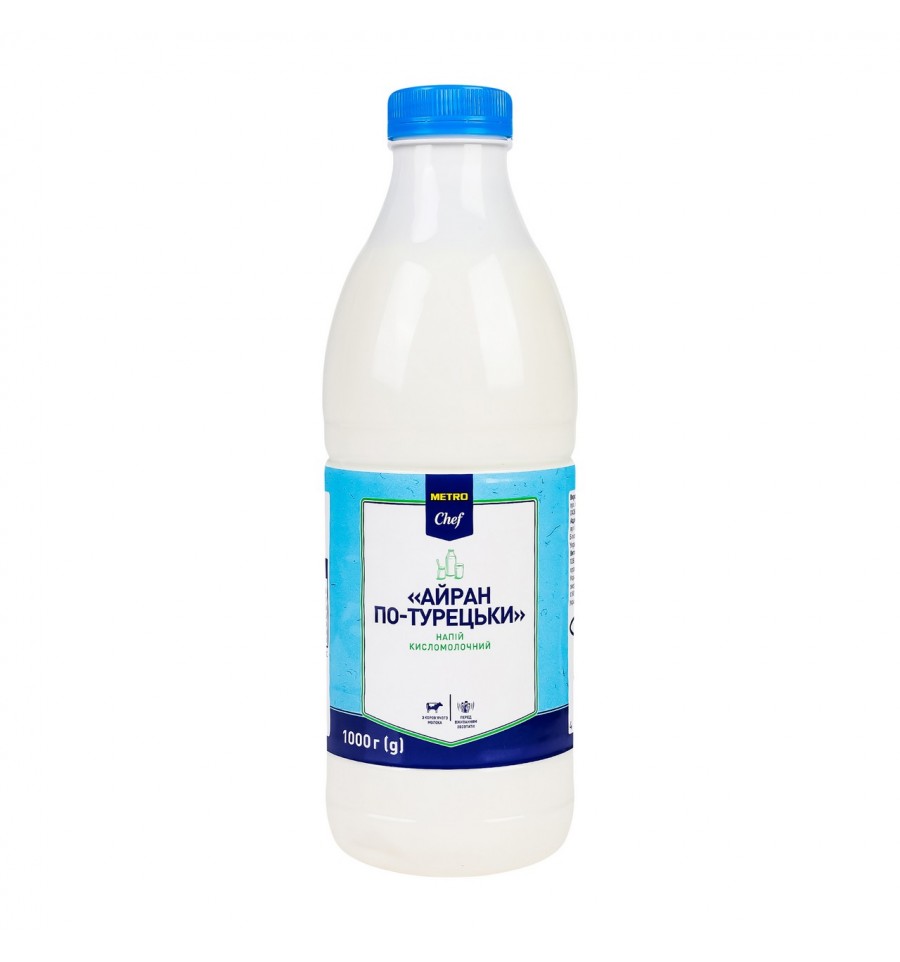 Напій Metro Chef Айран по-турецьки кисломолочний 1кг. Айран - це якісний кисломолочний продукт на основі коров’ячого молока, який користується великою популярністю на Кавказі, Балканах та країнах Середньої Азії. Виготовлений виробником на замовлення МЕTRO Cash&Carry за сучасною технологією збереження смакових і поживних властивостей. Чудово смакує як самостійний напій, так і як основа для холодних супів, соусів, заправок, маринадів. Втамовує спрагу, відновлює водно-сольовий баланс в організмі. Склад: молоко коров`яче незбиране, вода питна, сіль кухонна кисломолочна бактеріальна закваска. Алергени: МОЛОКО. Eнергетична цінність на 100г продукту: 35 ккал / 147 кДж, Жири - 1,8 г, Насичені жири - 1,1 г, Вуглеводи - 2 г, Цукри - 1,4 г, Білки - 2,7 г, Сіль - 1 г. Термін придатності - 30 діб. Зберігати за температури від +4° С до +6 °С в гериметично закритій упаковці в сухому приміщенні при відсутності прямого сонячного світла. Виробник: ТОВ «Арьяка». Адреса виробника: вул. Новомостицька, буд. 25, оф. 2, м. Київ, 04084, Україна. Тел. +38 098 317 74 74 +38 093 069 47 74 Адреса потужностей виробництва: вул. Центральна 47, с. Лосятин, Білоцерківський р-н, київська обл., 08667 , Україна. Вироблено на замовлення: ТОВ «Метро Кеш енд Кері Україна», 02140, Україна, м. Київ, просп. П. Григоренка, буд. 43. Країна: Україна. Маса нетто: 1000 г.