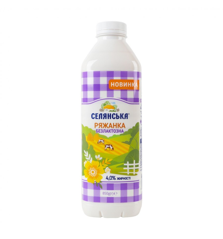 Ряжанка Селянська безлактозна 4% 850г. Склад: молоко коров`яче нормалізоване (99.96%), фермент лактаза, закваска чистих культур молочнокислих мікроорганізмів. Без ГМО. Енергетична цінність продукту: 264.2кДж/100г, 63.2ккал/100г. Поживна (харчова) цінність продукту: білки - 2.7г/100г, жири - 4г/100г, насичені жири - 2.6г/100г, вуглеводи - 4.1г/100г, з них цукри - 4.1г/100г, сіль - 0.1г/100г. Масова частка жиру: 4%. Рекомендовані способи застосування/вживання: перед вживанням збовтати. Умови зберігання: зберігати за температури 0..+6ºC. Термін придатності: 21 днів. Термін придатності після відкриття продукту: 24 години. Країна виробник: Україна. Виробник: ТОВ Люстдорф. Адреса виробничих потужностей: вул. Коцюбинського, буд. 1, м. Іллінці, Вінницький р-н, Вінницька обл., Україна, 22700. Маса нетто: 850г.
