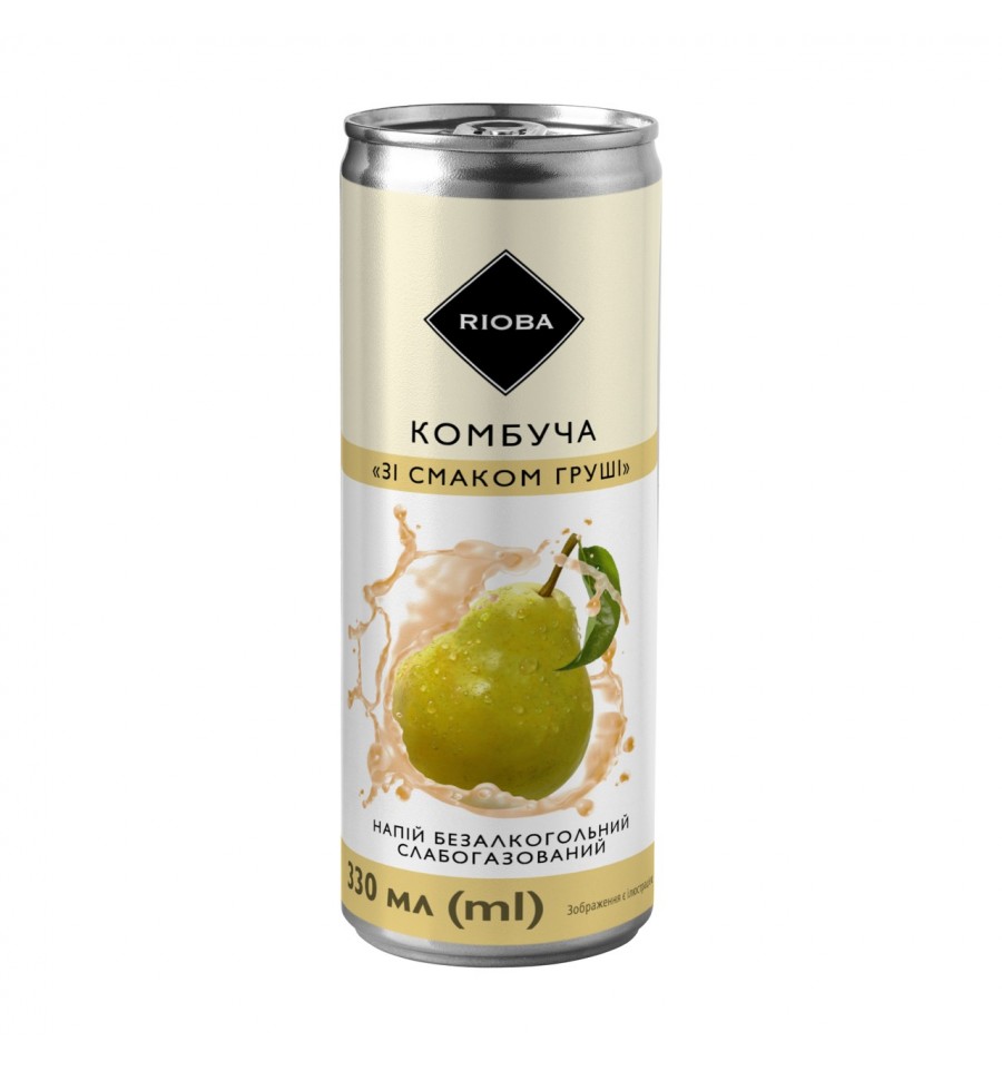 Напій безалкогольний слабогазований комбуча «Зі смаком груші» ТМ «RIOBA» ТУ У 11.0-41195609-003:2020 Склад: вода очищена, чорний чай, зелений чай, цукор, симбіотична культура бактерій чайного гриба SCOBY для ферментації, ароматизатор. Може містити мікрочастинки гриба та органічний осад. Поживна цінність в 100 мл (ml) продукту: Енергетична цінність — 79,4 кДж (kJ) / 19 ккал (kcal), Жири — 0 г (g), з них насичені — 0 г (g), Вуглеводи — 4,9 г (g), з них цукри — 4,9 г (g), Білки — 0 г (g), Сіль — 0 г (g). Дата «Краще спожити до» вказана на дні банки. Номер партії відповідає даті «Краще спожити до». Умови зберігання: при температурі від +4 °C до +8 °C в місці захищеному від попадання прямих сонячних променів. Після відкриття банки напій вжити протягом доби. Вживати з обережністю при синдромі надмірного бактеріального росту. Адреса виробника та виробничих потужностей: ТОВ «Іт Ізі»; проспект Академіка Глушкова, 12 А, місто Київ, 03188, Україна. Виготовлено на замовлення: ТОВ «Метро Кеш енд Кері Україна», просп. П. Григоренка, 43, м. Київ, 02140, Україна. З питань щодо продукту звертайтеся за телефоном гарячої лінії: 0 800 501 401 (безкоштовно в межах України). Об’єм: 330 мл (ml). Допустиме від’ємне відхилення 3 %.