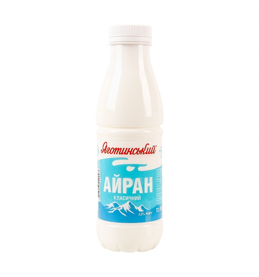 Айран Яготинський Класичний 2% 450г. Склад: молоко коров`яче незбиране, вода питна, сіль кухонна, молоко коров`яче знежирене, чисті культури молочнокислих бактерій. Без ГМО. Енергетична цінність продукту: 145кДж/100г, 35ккал/100г. Поживна (харчова) цінність продукту: білки - 2г/100г, жири - 2г/100г, насичені жири - 1.3г/100г, вуглеводи - 2.2г/100г, з них цукри - 2.2г/100г, сіль - 0.8г/100г. Масова частка жиру: 2%. Умови зберігання: зберігати за температури +4 (+/-2)ºC. Термін придатності: 35 днів. Країна виробник: Україна. Оператор ринку та адреса оператора ринку: ТДВ Яготинський маслозавод, вул. Шевченка, 213, м. Яготин, Київська обл., Україна, 07700. Маса нетто: 450г.