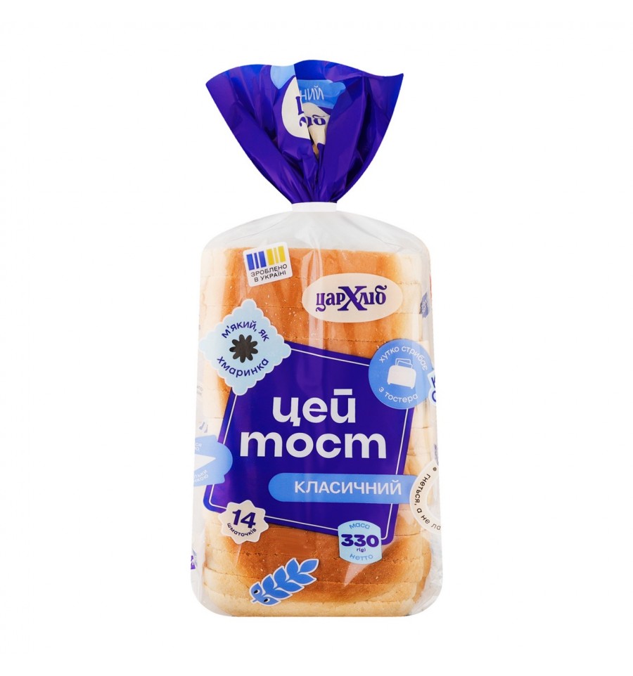 Хліб Цар хліб Цей тост Класичний нарізаний 330г. Склад: борошно пшеничне вищого ґатунку, вода питна, суміш хлібопекарська (цукор, борошно пшеничне, сіль, емульгатори: лактилат натрію Е481, моно- і дигліцериди жирних кислот Е471, борошно соєве, борошно пшеничне солодове, молоко сухе знежирене, ароматизатор Молоко,ферменти, антиокисник: аскорбінова кислота), цукор білий кристалічний, дріжджі хлібопекарські пресовані, олія соняшникова рафінована, поліпшувач хлібопекарський (борошно пшеничне, консервант сорбінова кислота Е200, олія пальмова, моно- і дигліцериди жирних кислот Е471), молоко сухе знежирене. Без ГМО. Енергетична цінність продукту: 1207.7кДж/100г, 288.6ккал/100г. Поживна (харчова) цінність продукту: білки - 8.4г/100г, жири - 5.6г/100г, насичені жири - 1.2г/100г, вуглеводи - 54.4г/100г, з них цукри - 6.4г/100г, сіль - 1.2г/100г. Рекомендований спосіб приготування/вживання: готовий до вживання. Умови зберігання: зберігати за температури +6..+28ºC. Термін придатності: 1 місяць. Країна виробник: Україна. Виробничі потужності та адреса виробничих потужностей: ТОВ Перший Столичний Хлібозавод, вул. Соборна, 85, с. Нові Петрівці, Вишгородський р-н, Київська обл., Україна, 07354. Маса нетто: 330г.