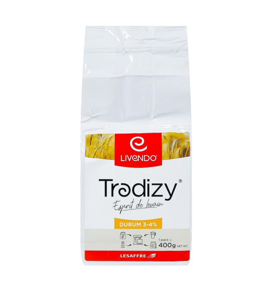 Суміш хлібопекарська Livendo Tradizy Дурум з активною мікрофлорою на основі закваски 400г. Склад: суха закваска з пшениці дурум (борошно пшеничне дурум, борошно пшеничне, мікроорганізми закваски), дріжджі, дріжджовий екстракт, олія соняшникова, аскорбінова кислота, ферменти, бактерії для закваски. Енергетична цінність продукту: 1564.1кДж/100г, 371ккал/100г. Поживна (харчова) цінність продукту: білки - 27.5г/100г, жири - 5.5г/100г, насичені жири - 0.88г/100г, вуглеводи - 49.5г/100г, з них цукри - 7г/100г, сіль - 0.39г/100г. Умови зберігання: зберігати за температури не вищої ніж +25ºC. Сухе, прохолодне місце. Термін придатності: 18 місяців. Температура зберігання після відкриття продукту: зберігати за температури 0..+6ºC. Термін придатності після відкриття продукту: 7 днів. Країна виробник: Франція. Виробник: LIS France. Адреса виробничих потужностей: 73, рю де ля Гар, Серанс, Франція, 50510. Імпортер та адреса імпортера: ТОВ Лесаффр Україна, вул. Бориспільська, 9, корп. 91, м. Київ, Україна, 02099. Маса нетто: 400г.