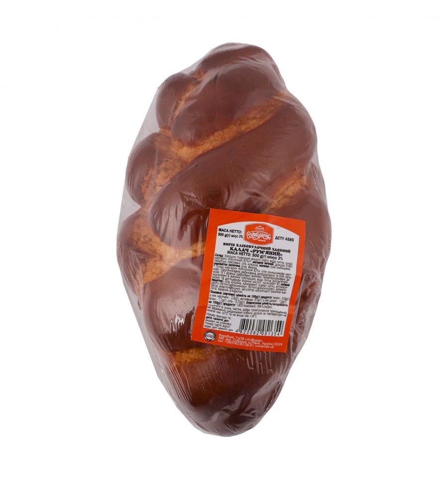 Калач Рум`янець Рум`яний здобний 500г. Склад: борошно пшеничне вищого сорту, вода питна, цукор, маргарин Молочний 82% (олія соняшникова частково гідрогенізована рафінована дезодорована та олія пальмова та її фракції рафіновані вибілені переетерифіковані дезодоровані в змінних пропорціях, вода питна, емульгатори (моно- та дигліцериди жирних кислот, полісорбат 80), соєвий лецитин), сіль кухонна, консервант сорбат калію, антиоксиданти (бутилгідроксианізол, бутилгідрокситолуен), ароматизатор Масло-вершки, регулятор кислотності лимонна кислота, барвник β-каротин), меланж яєчний, дріжджі хлібопекарські пресовані, сіль кухонна, молоко сухе знежирене, сироватка молочна суха, ванілін. Енергетична цінність продукту: 1303кДж/100г, 308ккал/100г. Поживна (харчова) цінність продукту: білки - 7.7г/100г, жири - 5.5г/100г, насичені жири - 2.3г/100г, вуглеводи - 57г/100г, з них цукри - 12г/100г, сіль - 0.7г/100г. Умови зберігання: зберігати за температури +6..+28ºC. Чисте, сухе, добре вентильоване, без шкідників місце. Термін придатності: 3 дні. Країна виробник: Україна. Виробник та адреса виробника: ТзОВ Хлібодар, вул. Соборна, 446, м. Рівне, Україна, 33024. Маса нетто: 500г.