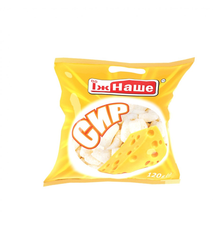 Палички кукурудзяні зі смаком Сиру. Склад :крупа кукурудзяна(60,48%),олія соняшникова рафінована дезодорована (24,19%),вода,сіль поварена харчова (0,21%),ароматизатор – сир (15,12%). Без штучних барвників та консервантів. ДСТУ 2903:2005. Енергетична цінність: 2018 kJ (кДж )/ 481 / kcal(ккал). Жири - 22 g (г),З них насичені - 2,6 g (г),Вуглеводи - 63,8 g (г),З них цукри - 0,1 g (г),Білки - 7,0 g (г),Сіль - 1,9 g (г). Термін придатності: 6 місяців. Номером парті (L) та кінцева дата «Краще спожити до» (В) зазначені в правому верхньому куті пакета. Дата виробництва відповідає номер партії (L). Умови зберігання: зберігати у чистих,сухих,добре вентильованих приміщеннях,які не заражені шкідниками хлібних запасів,за температури t не вищої ніж плюс 20ºС і відносній вологості повітря не вищої ніж 75%. Не піддавати впливу прямого сонячного світла. Виробник: ПП «УКРКОРН»,вул. Спасо-Преображенська,110,с. Мошни,Черкаська область,19615,Україна. Тел.: +38 (093) 2473909,Е-mail: a20172014@gmail.com. Адреса потужностей виробництва: вул. Спасо-Преображенська,170, с. Мошни,Черкаська область,19615,Україна, Без ГМО. Вироблено в Україні. На підприємстві впроваджена система управління безпечністю харчових продуктів. ДСТУ ISO 22000:2007 (ISO 2200:2005). Маса нетто: 120 g (г). Допустиме мінусове відхилення 4,5%.