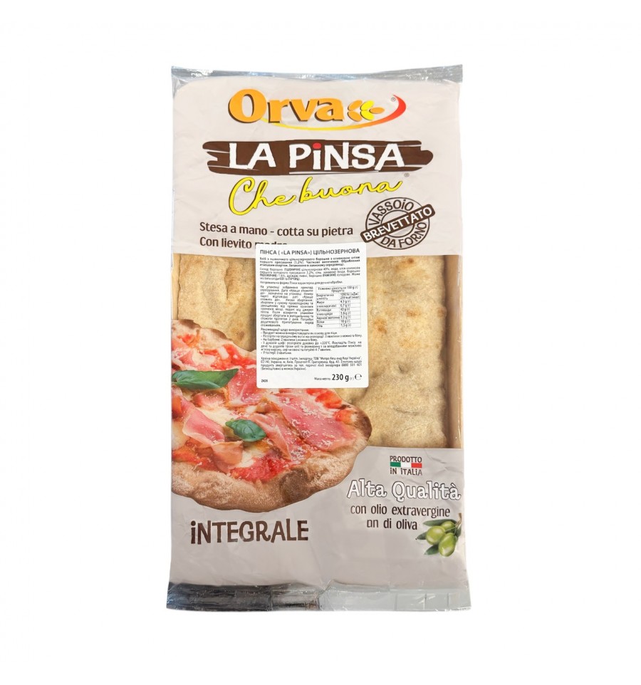 Пінса ( «La Pinsa») Цільнозернова. Хліб з пшеничного цільнозернового борошна з оливковою олією першого пресування (3,2%). Частково випечений. Оброблений етиловим спиртом. Запаковано в захисному середовищі. Склад: борошно ПШЕНИЧНЕ цільнозернове 49%, вода, олія оливкова першого холодного пресування 3,2%, сіль, закваска (вода, борошно ПШЕНИЧНЕ) 1,6%, дріжджі пивні, борошно ЯЧМІННЕ солодове. Може містити сліди СОЇ та ГІРЧИЦІ. Енергетична цінність: 1092 kJ (кДж)/ 259 kcal (ккал). Жири - 4,3 g (г), з них насичені - 0,7 g (г), Вуглеводи - 42,0 g (г), з них цукри - 3,8 g (г), Харчові волокна - 5,2 g (г), Білки - 10,0 g (г), Сіль - 1,3 g (г). На упаковці зображено приклад сервірування. Дата «Краще спожити до» зазначена на упаковці. Номер партії відповідає даті «Краще спожити до». Умови зберігання: зберігати у сухому прохолодному та захищеному від прямих сонячних променів місці, подалі від джерел тепла. Після відкриття упаковки продукт зберігати в холодильнику та спожити протягом 2 днів. Потребує додаткового приготування перед споживанням. Рекомендації щодо використання: Продукт можна використовувати як основу для піци. Розігріти на середньому вогні на сковороді: 3 хвилини з кожного боку. На барбекю: 2 хвилини з кожного боку. У духовій шафі: розігрійте духовку до +220°C. Покладіть Пінсу на деко та додайте трохи олії та розмарину і за вподобанням можливо м’ясну нарізку, сир чи овочі та готуйте 4-7 хвилин. У тостері: 3 хвилини. Неправильна форма Пінси характерна для ручної обробки. Країна походження: Італія. Імпортер: ТОВ "Метро Кеш енд Кері Україна", 02140, Україна, м. Київ, Проспект П. Григоренка, буд. 43. З питань щодо продукту звертайтесь за тел. гарячої лінії імпортера 0800 501 401 (безкоштовно в межах України). Маса нетто: 230г.