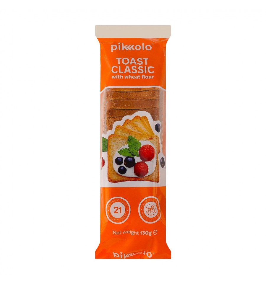 Грінки Pikolo Classic тостові 130г. Склад: борошно пшеничне вищого сорту (98.7%), вода питна, олія соняшникова високоолеїнова рафінована, цукор білий, молоко сухе, клейковина суха, дріжджі пресовані, екстракт ячмінний, сіль кухонна. Енергетична цінність продукту: 1832.4кДж/100г, 434ккал/100г. Поживна (харчова) цінність продукту: білки - 10.9г/100г, жири - 9г/100г, насичені жири - 1.4г/100г, вуглеводи - 77.3г/100г, з них цукри - 7.7г/100г, сіль - 1г/100г. Умови зберігання: зберігати за температури 0..+22ºC і відносній вологості повітря 65-75%. Термін придатності: 12 місяців. Країна виробник: Україна. Виробник та адреса виробника: ТОВ Хліб-Трейд, вул. Львівська бічна, 4, с. Сокільники, Львівський р-н, Львівська обл., Україна, 81130. Кількість: 21шт. Маса нетто: 130г.