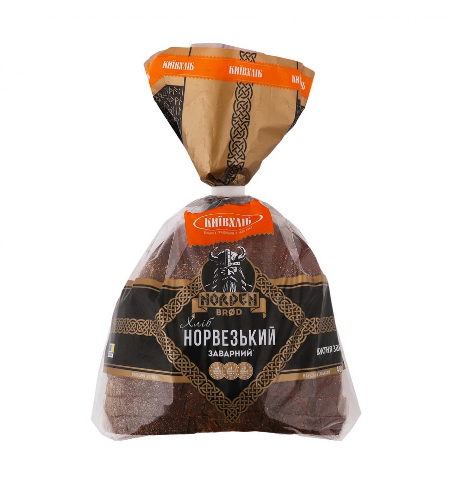 Хліб Київхліб Норвезький заварний половинка в нарізці 400г. Склад: борошно пшеничне першого сорту, вода питна, борошно житнє обдирне 8.4%, сироп цукровий, пластівці картопляні (картопля суха 99%, емульгатор моно- та дигліцериди жирних кислот, консервант метабісульфіт натрію, стабілізатор пірофосфати, антиоксидант ефіри жирних кислот аскорбінової кислоти, регулятор кислотності лимонна кислота, куркума), клейковина пшенична суха, солод ячмінний темний, цукор, дріжджі пресовані, закваска житня рідка 1.8% (містить глютен), сіль кухонна, поліпшувачі борошна (містять глютен), кмин. Без ГМО. Енергетична цінність продукту: 1024кДж/100г, 242ккал/100г. Поживна (харчова) цінність продукту: білки - 8.2г/100г, жири - 1.1г/100г, насичені жири - 0.2г/100г, вуглеводи - 49г/100г, з них цукри - 7.6г/100г, сіль - 1.47г/100г. Умови зберігання: зберігати за температури +6..+28ºC. Термін придатності: 5 днів. Країна виробник: Україна. Адреса виробничих потужностей: вул. А. Цедіка, 4Б, м. Київ, Україна, 03057. Оператор ринку: ТОВ "Алвіва Банс". Маса нетто: 400г.