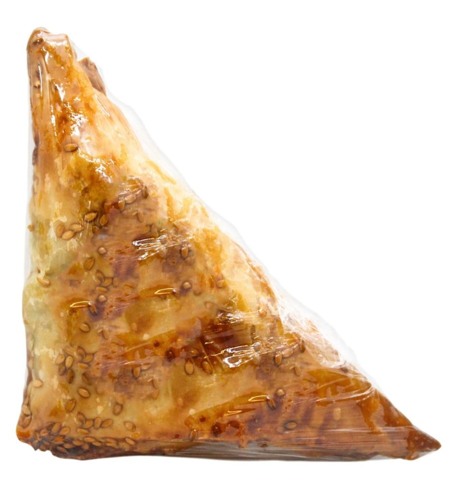 Самса Levada з сиром та зеленню 100г. Склад: тісто (борошно пшеничне вищого сорту, вода питна, олія соняшникова рафінована дезодорована, крохмаль кукурудзяний, сіль кухонна, клейковина пшенична, поліпшувач), начинка (сир кисломолочний - 50%, шпинат швидкозаморожений - 20%, продукт сирний молоковмісний (молоко коров`яче знежирене, молоко коров`яче незбиране, замінник молочного жиру (олії соняшникова та пальмова рафіновані дезодоровані в натуральному та частково гідрогенізованому вигляді, емульгатори (Е471, лецитин соєвий), барвник бета-каротин, ароматизатор Масло вершкове, антиоксиданти (Е320, Е321)), суміш стабілізаційна (Е1414), закваска чистих культур молочнокислих бактерій), вода питна, кріп свіжий - 3%, меланж яєчний, олія соняшникова рафінована дезодорована, крохмаль кукурудзяний, цибуля смажена сушена, сіль кухонна, часник сушений, перець чорний мелений, базилік сушений), жир кондитерський (олії та жири рослинні рафіновані вибілені дезодоровані: олія пальмова та її фракції, олія соняшникова в змінних пропорціях, емульгатор дистильований моногліцерид, ароматизатор Масло, антиоксиданти (аскорбіл пальмітат, суміш токоферолів (Е304(i), Е306)), льєзон (меланж яєчний, вершки, вода питна, олія соняшникова рафінована дезодорована, мальтодекстрин), посипання (насіння льону). Енергетична цінність продукту: 1071кДж/100г, 256ккал/100г. Поживна (харчова) цінність продукту: білки - 7.4г/100г, жири - 14.4г/100г, насичені жири - 5.4г/100г, вуглеводи - 24.4г/100г, з них цукри - 1.7г/100г, сіль - 0.8г/100г. Умови зберігання: зберігати за температури +5..+25ºC. Термін придатності: 48 годин. Країна виробник: Україна. Виробничі потужності та адреса виробничих потужностей: ТОВ Торговий Дім Левада, вул. Середня, 36, м. Одеса, Україна, 65091. Маса нетто: 100г.