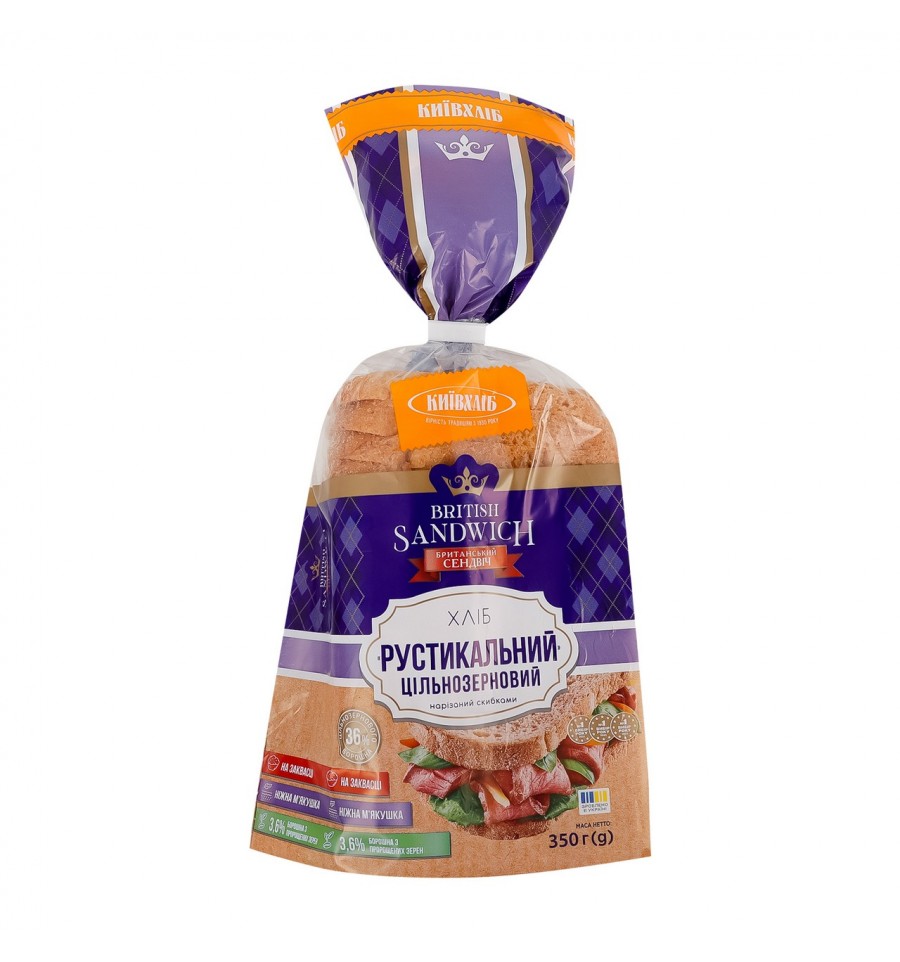 Хліб Київхліб Рустикальний нарізний цільнозерновий 350г. Склад: борошно пшеничне цільнозернове 36%, борошно пшеничне першого сорту, вода питна, борошно з пророщених зерен пшениці 3.6%, клейковина пшенична суха, цукор, олія соняшникова рафінована, дріжджі хлібопекарські пресовані, сіль кухонна, борошно з м`якої пшениці вищого сорту (крупка), закваска житня (містить борошно житнє), поліпшувач борошна (містить борошно пшеничне). Без ГМО. Енергетична цінність продукту: 1151кДж/100г, 273ккал/100г. Поживна (харчова) цінність продукту: білки - 10.6г/100г, жири - 4.6г/100г, насичені жири - 0.6г/100г, вуглеводи - 45г/100г, з них цукри - 3.4г/100г, сіль - 1.5г/100г. Умови зберігання: зберігати за температури +6..+28ºC. Термін придатності: 5 днів. Країна виробник: Україна. Виробничі потужності та адреса виробничих потужностей: ТОВ Торговий дім Київ Хліб, вул. А. Цедіка, 4Б, м. Київ, Україна, 03057. Маса нетто: 350г.