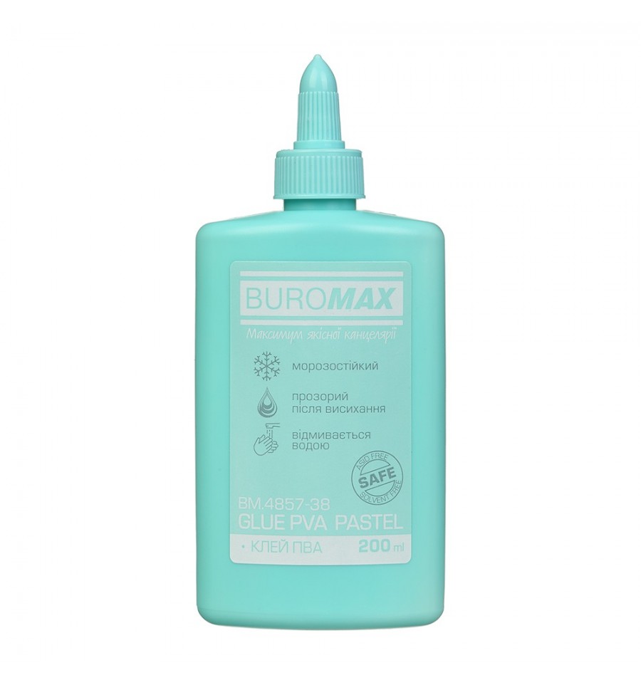 Клей ПВА серії PASTEL від BUROMAX - стане незамінним помічником у роботі. Підходить для щоденного використання в офісі, вдома, а також для творчості. Пластикова пляшка виготовлена в ніжному пастельному кольорі, сумісному з іншими канцелярськими товарами серії PASTEL, дає можливість створити робочу зону в улюбленій кольоровій гамі. об'єм - 200 мл має класичну основу ПВА (полівінілацетат), клей білого кольору має високу адгезію та дуже гарні клейові властивості для склеювання паперу, картону, фотографій, дерева, тканини, корки морозостійкий (до 6 циклів заморожування-розморожування зберігає свої властивості) пластиковий флакон з дозатором, який викручується ковпачок-дозатор регулює подачу клею та запобігає висиханню клей наноситься як тонкою лінією так і краплями в горизонтальному положенні не витікає змивається водою колір флакона - м'ятний