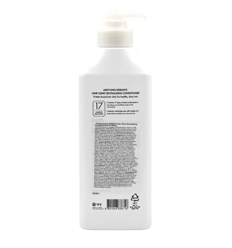 Протеїновий догляд для здорового, блискучого волосся. Містить 17 типів білків амінокислот. Живильний догляд, який наповнює внутрішню частину волосся поживними речовинами. Інтенсивний догляд за обсягом з олією шипшини. Робить ослаблене волосся здоровішим і надає йому об’єм. Спосіб використання: Нанесіть на вологе волосся після шампуню масажними рухами та ретельно змийте. Застереження: 1. Використовувати тільки за призначенням. 2. Негайно промийте очі після контакту з вмістом продукту. 3. Зверніться до лікаря, якщо ви відчуваєте будь-які ненормальні симптоми, такі як почервоніння, набряк або свербіж під час використання або під впливом прямих сонячних променів після використання. 4. Утримайтеся від використання на відкритих ранах. 5. Відмова від миття після використання може призвести до випадання або відбілювання волосся. 6. Будьте обережні, щоб не посковзнутися під час контакту з вмістом продукту. 7. Зберігання та поводження 1) Зберігати в недоступному для дітей місці, 2) Уникати впливу прямих сонячних променів. 3) Не зберігайте продукт при високих або низьких температурах. Якщо верхня частина кришки дозатора не висувається, щільно закрийте нижню частину кришки, а потім поверніть верхню частину. Ingredient (INCI) Склад: Water, Cetearyl Alcohol, Stearyl Alcohol, Behentrimonium Chloride, Dimethicone, Rosa Canina Fruit Oil, Lysine, Histidine, Arginine, Aspartic Acid, Threonine, Serine, Glutamic Acid, Proline, Glycine, Alanine, Valine, Methionine, Isoleucine, Leucine, Tyrosine, Phenylalanine, Cysteine, Hydrolyzed Wheat Protein, Hydrolyzed Soy Protein, Hydrolyzed Rice Protein, Dipropylene Glycol, Caprylyl Glycol, Lactic Acid, Potassium Lactate, Polyglyceryl-2 Stearate, Amodimethicone, Glyceryl Stearate, 1,2-Hexanediol, Glycerin, Fragrance, Geraniol, Hexyl Cinnamal, Limonene / Вода, цетеариловий спирт, стеариловий спирт, бегентрімоніум хлорид, диметикон, олія плодів Rosa Canina, лізин, гістидин, аргінін, аспарагінова кислота, треонін, серин, глутамінова кислота, пролін, гліцин, аланін, валін, метіонін, ізолейцин, лейцин, тирозин, Фенілаланін, цистеїн, гідролізований протеїн пшениці, гідролізований протеїн рису, дипропіленгліколь, каприлілгліколь, молочна кислота, лактат калію, полігліцерил-2 стеарат, амодиметикон, гліцерилстеарат, 1,2-гександиол, гліцерин, ароматизатор Гераніол, гексил циннамаль, лімонен. Країна походження: Республіка Корея. Виробник та його місцезнаходження: Aekyung Co., Ltd. Aekyung Industrial Co., Ltd. / Аекюнг Ко., Лтд. Аекюнг Індустріал Со., Лтд. 1547-9 Чунгуі-ро, Йеонгсан-Мєон, Чеонгянг-Гун, Чунгченгангам-до 33353, Корея. Дистрибьютор: ТОВ "АЛЬТЕРНАТИВА-СВ", м.Київ, вул.Магнітогорська, буд.1, офіс 516, тел 067-254-39-33 10 29, e-mail: operator@aktivst.com. Умови зберігання: зберігати в пакуванні виробника за температури від плюс 5 ⁰С до плюс 25 ⁰С та відносній вологості повітря 55% - 70%, не піддавати впливу прямих сонячних променів. Не допускається зберігання засобу на відстані менше ніж 0,5 m (м) від працюючих (увімкнених) опалювальних та нагрівальних приладів, відкритого вогню. Термін придатності (зберігання): 3 роки. Дата закінчення терміну придатності, номер партії: вказано на упаковці. Термін придатності після відкриття: 12 місяців. Номінальний об’єм: 400 ml (мл). Допустиме від’ємне відхилення 3%. Претензії щодо якості та звернення про отримання технічного опису інгредієнтів приймає імпортер.