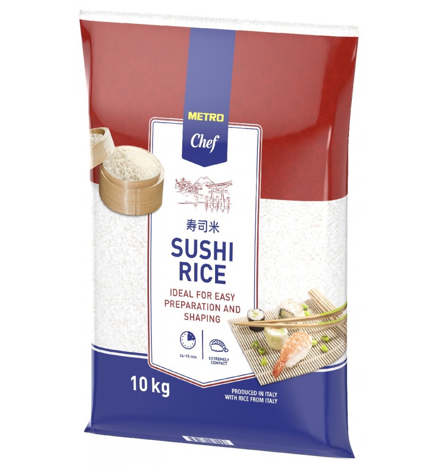 Рис круглозернистий для суші, ТМ «METRO Chef». Склад: 100% рис. Енергетична цінність на 100 г: 1496 кДж/353 ккал, жири – 1,1 г, з них насичені – 0,2 г, вуглеводи – 78,4 г, з них цукри – 0,3 г, білки – 6,8 г, сіль – <0,01 г. Спосіб приготування: варити у киплячій воді 14–15 хвилин. Умови зберігання: зберігати за кімнатної температури, подалі від сонячних променів та джерел тепла. Після відкриття зберігати у герметичній тарі. Країна походження: Італія. Виробник: Agrover srl, Via M. Garda 1, 13034 Ліньяна, Італія. Імпортер: ТОВ «МЕТРО Кеш енд Кері Україна», просп. П. Григоренка, 43, м. Київ, 02140, Україна. З питань щодо продукту звертайтесь за тел. гарячої лінії імпортера: 0800 501 401 (безкоштовно в межах України). Маса нетто: 10 кг.