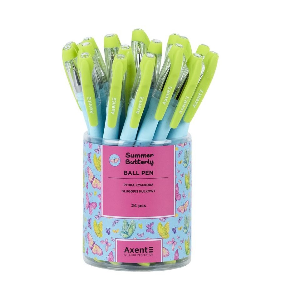 Ручка кулькова Axent AB1049-41-A Summer Butterly синя – яскрава, якісна та зручна. Вона чудово пише, комфортно лягає в руку і заворожує неповторним дизайном.Швейцарський пишучий вузол Premec діаметром 0,5 мм забезпечує рівномірну подачу чорнила: ручка пише легко та плавно, не вимагаючи сильного натискання.Завдяки якісним німецьким чорнилам Documental, лінія виходить чітка та насичена. Ручка не мажеться та не залишає прогалин. Завдяки економній витраті чорнил, ручка буде довго радувати вас бездоганною функціональністю.Прогумований корпус має приємну на дотик матову текстуру, завдяки чому ручка не ковзає під час письма.Стержень має довжину 136 мм, пишучий вузол – 0,5 мм. Довжина написання – 1100 м.Стильний дизайн підніматиме настрій та подарує море позитивних емоцій.