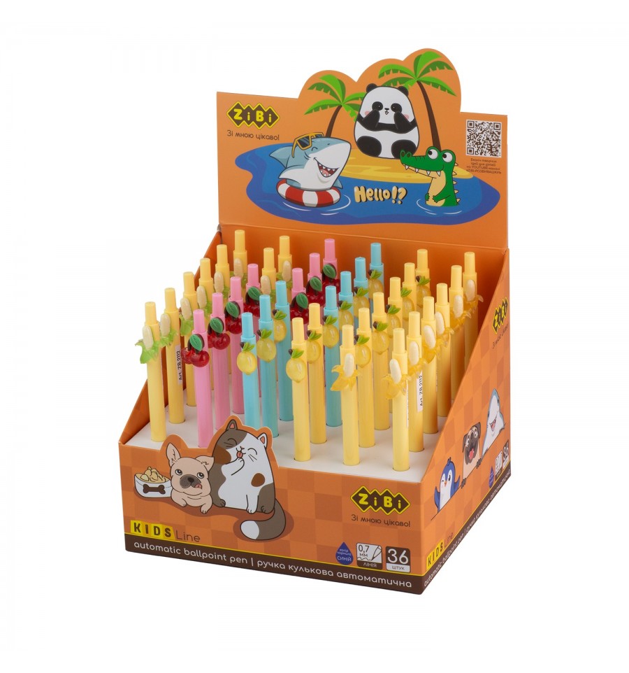 Автоматична кулькова ручка FRUITS від ZiBi – відмінний інструмент для письма на кожен день. Оригінальне дизайнерське рішення у вигляді стильного креативного декору на корпусі, робить ці ручки улюбленим функціональним помічником школярів, студентів, а також творчих і креативних людей для використання у навчанні, веденні щоденників, записі нових ідей та планів.товщина лінії письма 0.7 мм колір чорнила: синій надійний пишучий вузол, виготовлений за класичною для кулькових ручок технологією кругла форма корпусу оптимального діаметру, зручна для тривалого письма кнопковий автоматичний механізм дозволяє сховати пишучий наконечник та запобігти його пошкодженню, а також забрудненню чорнилом сусідніх з ручкою речей змінний стрижень завдовшки 110 мм прозора частина корпусу біля кінчика ручки для можливості контролю залишку чорнила матеріал корпусу: глянцевий пластик ніжних пастельних кольорів упаковка: картонний шоу-бокс що містить 36 ручок в шести дизайнах