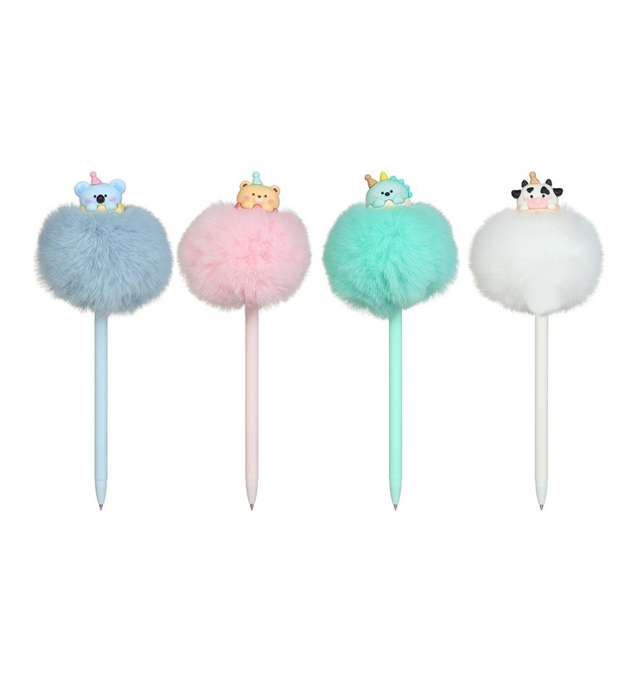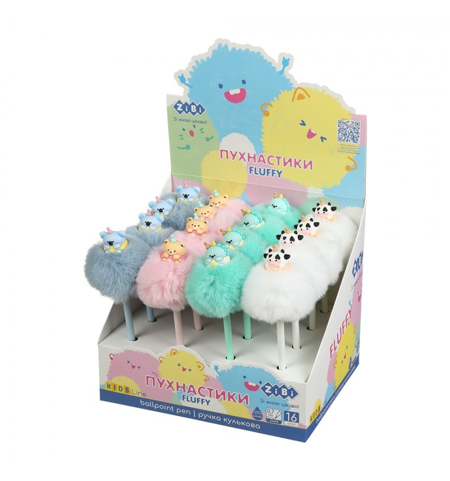 Кулькова ручка з помпоном FLUFFY PARTY від ZiBi – оригінальний та цікавий подаруночок і інструмент для письма. Дизайнерське рішення у вигляді великого помпону та фігурки-декору звірятка на корпусі, виконаної в тематиці вечірки, робить ці ручки улюбленцями школярів, студентів, а також творчих і креативних людей для створення святкового настрою, записів, сюрпризів, ігор з використанням інструментів для письма.великий помпон на кінці корпусу діаметром близько 8 см з приємного на дотик пухнастого штучного хутра асорті кольорів (пудровий, м'ятний, білий, світло-сірий) товщина лінії письма ручки 0.7 мм колір чорнила: синій надійний пишучий вузол, виготовлений за класичною для кулькових ручок технологією кругла форма корпусу невеликого діаметру вентильований ковпачок захищає наконечник ручки, запобігає забрудненню чорнилом предметів навколо та робить використання безпечнішим змінний стрижень завдовшки 131 мм матеріал корпусу: матовий пластик кольорів асорті (пудровий, м'ятний, білий, світло-сірий) упаковка: картонний шоу-бокс що містить 16 ручок в чотирьох дизайнах асорті