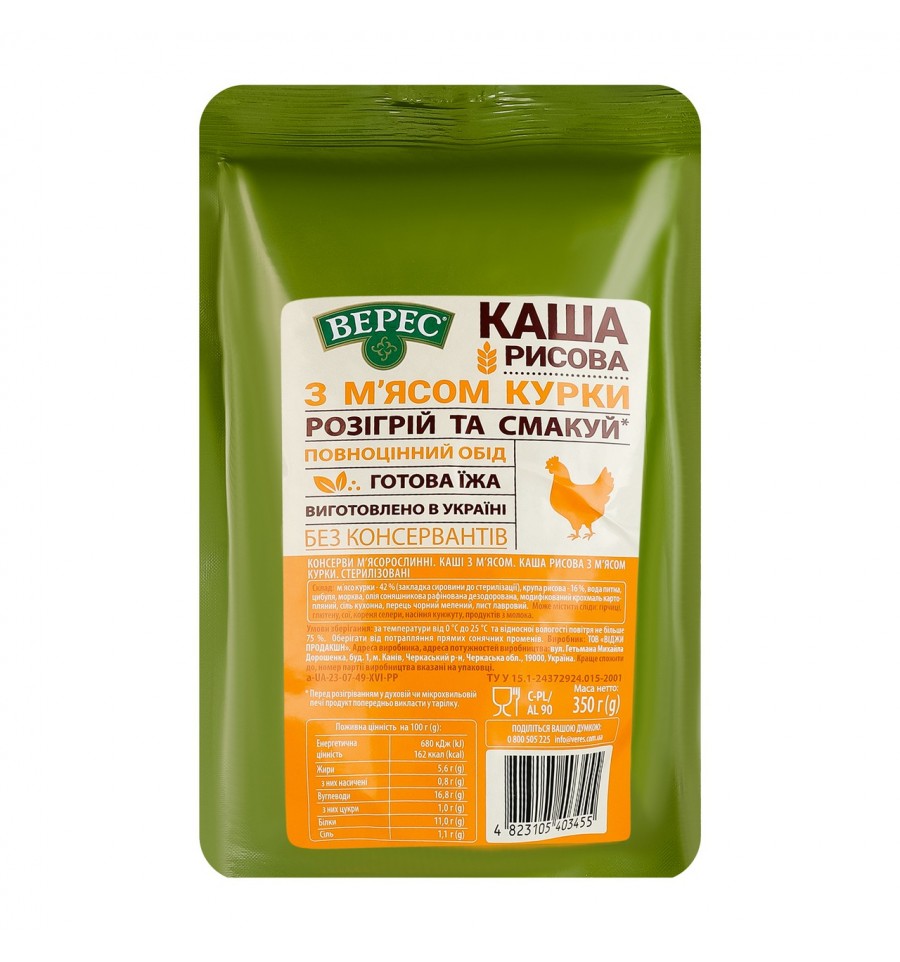 Каша Верес рисова з м`ясом курки 350г. Склад: м`ясо курки - 42% (закладка сировини до стерилізації), крупа рисова - 16%, вода питна, цибуля, морква, олія соняшникова рафінована дезодорована, модифікований крохмаль картошляний, сіль кухонна, перець чорний мелений, лист лавровий. Енергетична цінність продукту: 680кДж/100г, 162ккал/100г. Поживна (харчова) цінність продукту: білки - 11г/100г, жири - 5.6г/100г, насичені жири - 0.8г/100г, вуглеводи - 16.8г/100г, з них цукри - 1г/100г, сіль - 1.1г/100г. Рекомендований спосіб приготування/вживання: перед розігріванням у духовій чи мікрохвильовій печі продукт попередньо викласти у тарілку. Умови зберігання: зберігати за температури 0..+25ºC і відносній вологості повітря не більше 75%. Без потрапляння прямих сонячних променів. Термін придатності: 2 роки. Країна виробник: Україна. Виробничі потужності та адреса виробничих потужностей: ТОВ Віджи Продакшн, вул. Гетьмана Михайла Дорошенка, буд. 1, м. Канів, Черкаський р-н, Черкаська обл., Україна, 19000. Маса нетто: 350г.