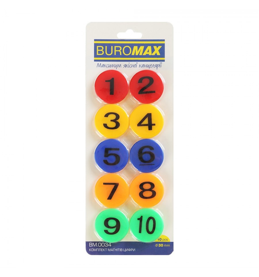 Комплект кольорових магнітних тримачів ЦИФРИ від BUROMAX – для фіксації документів, нотаток, замальовок, плакатів, планів, графіків та інших посібних матеріалів на магнітно-маркерних дошках та фліпчартах, а також у побуті, для декоративного оформлення, на звичайному холодильнику. Може використовуватися офісними працівниками, доповідачами, студентами, працівниками освітніх установ, домашніми користувачами.• надійний, сильний магніт • покриття – кольоровий міцний ударовитривалий пластик • стійкі до механічних пошкоджень та ультрафіолету – не дряпаються, не вигоряють • можна використовувати для систематизації записів завдяки різним кольорам та цифрамТехнічні характеристики • кількість в наборі – 10 шт. • діаметр – 30 мм • кольори – жовтий, синій, салатовий, червоний, темно-жовтийСклад магніт, пластикове покриття