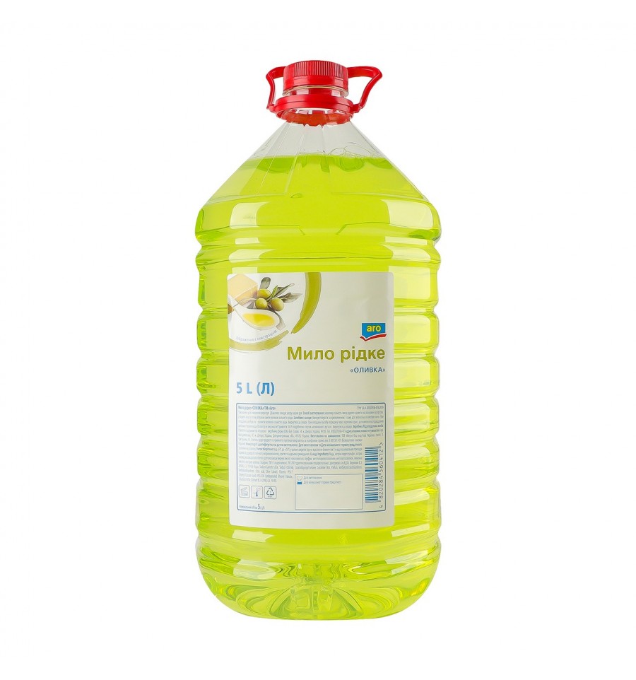 Мило рідке Aro Оливка 5л. Склад: вода, натрію лауретсульфат, натрію хлорид, кокамідопропілбетаїн, діетаноламіди жирних кислот кокосової олії, віддушка, метілхлороізотіазолінон, метілізотіазолінон, лимонна кислота, екстракт оливки, гліцерин, ПЕГ-7 гліцерілкокоат, ПЕГ-200 гідрогенізовананий гліцерилпальмат, динатриєва сіль ЕДТА, барвники (С.І. 42090, C.I. 19140). Рекомендований спосіб приготування/вживання: невелику кількість мила рідкого нанести на зволожену шкіру рук, утворити піну та потім ретельно змити великою кількістю води. Умови зберігання: зберігати за температури +5..+25ºC. Без потрапляння прямих сонячних променів. Термін придатності: 2 роки. Термін придатності після відкриття продукту: 12 місяців. Країна виробник: Україна. Виробник та адреса виробника: Приватне підприємство Науково-виробнича фірма СВК, б-р Слави, 54, м. Дніпро, Україна, 49126. Адреса виробничих потужностей: вул. Мандриківська, 47, м. Дніпро, Дніпропетровська обл., Україна, 49126. Об`єм: 5л.