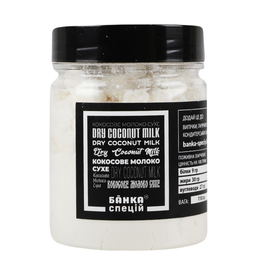 Молоко кокосове Банка Спецій сухе 110г. Склад: кокосове молоко сухе. Енергетична цінність продукту: 456ккал/100г. Поживна (харчова) цінність продукту: білки - 9г/100г, жири - 30г/100г, вуглеводи - 27г/100г. Рекомендований спосіб приготування/вживання: додай це до: випічки, гарячих напоїв, кондитерських виробів. Умови зберігання: зберігати за температури +5..+25ºC і відносній вологості повітря не більше 65%. Сухе місце, без потрапляння прямих сонячних променів. Термін придатності: 12 місяців. Країна виробник: Україна. Виробник та адреса виробничих потужностей: ТОВ Банка Спецій, Тяжилівський тупик, 1є, м. Вінниця, Україна. Маса нетто: 110г.