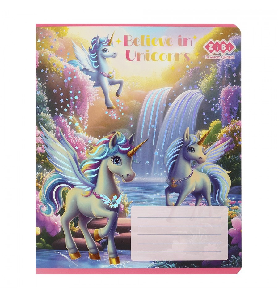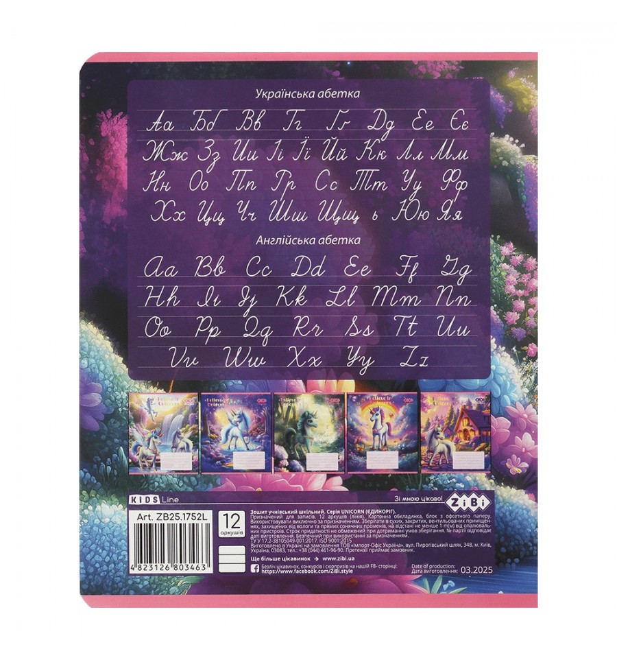 Зошит учнівський шкільний серії UNICORN від ZiBi - має дуже милий яскравий дизайн, чудово підходить для навчання в школі, виконання класних, домашніх та контрольних робіт, чорнетки, тощо.12 аркушів Зошит в лінію, друк блакитним кольором, має червоні поля Розмір виробу 203х167 мм (стандартний зошит) Тип скріплення – скоба Внутрішній блок – офсетний папір щільністю 55 г/м², білизна паперу 98-100% Обкладинка виконана з целюлозного картону (щільністю 190 г/м²) з крейдованим шаром, повнокольоровим друком та поліграфічними ефектами: вибірковий УФ лак та тиснення срібною голографічною фольгою На форзацах розміщено довідкові матеріали з письма для молодших класів НУШ Заокруглені куточки аркушів та обкладинки забезпечать їхню охайність протягом всього терміну використання Має рядки для підпису на лицьовій стороні обкладинки На задній стороні обкладинки розміщені прописи української і англійської абетки Дизайн обкладинки асорті Групова упаковка: 25 шт. в 5-ти кольорових дизайнах