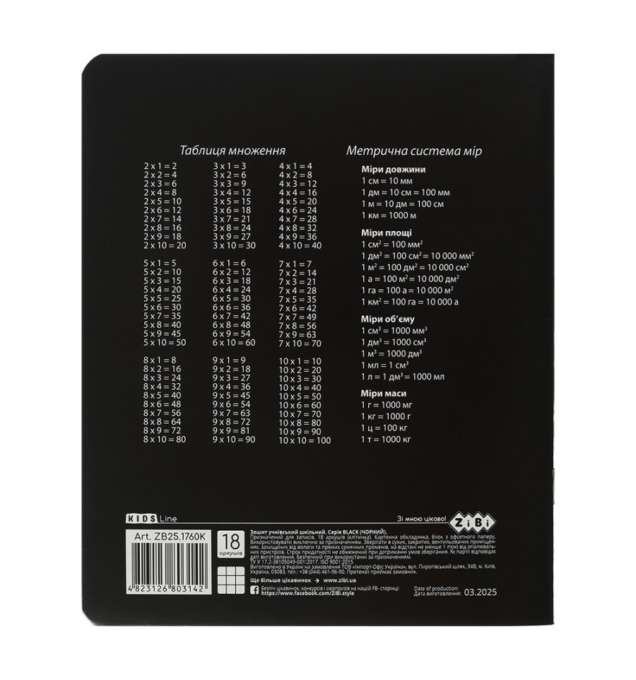 Зошит учнівський шкільний серії BLACK від ZiBi - має креативний і лаконічний дизайн, чудово підходить для навчання в школі, виконання класних, домашніх та контрольних робіт, чорнетки, тощо.18 аркушів Зошит в клітинку, друк блакитним кольором, має червоні поля Розмір виробу 203х167 мм (стандартний зошит) Тип скріплення – скоба Внутрішній блок – офсетний папір щільністю 55 г/м², білизна паперу 98-100% Обкладинка виконана з целюлозного картону (щільністю 190 г/м²) з крейдованим шаром Заокруглені куточки аркушів та обкладинки забезпечать їхню охайність протягом всього терміну використання Має рядки для підпису на лицьовій стороні обкладинки На задній стороні обкладинки розміщена таблиця множення та метрична система мір Колір обкладинки чорний Групова упаковка: 20 шт. одного дизайну