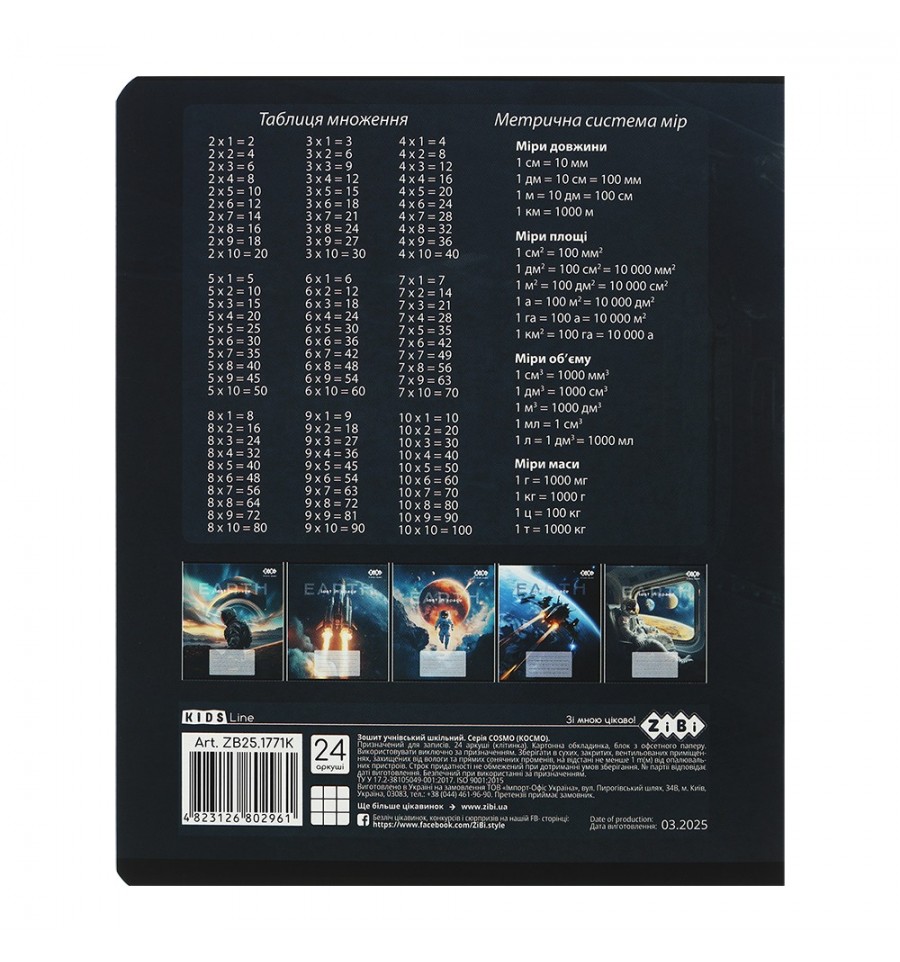 Зошит учнівський шкільний серії COSMO від ZiBi - має стильний креативний дизайн, чудово підходить для навчання в школі, виконання класних, домашніх та контрольних робіт, чорнетки, тощо.24 аркуши Зошит в клітинку, друк блакитним кольором, має червоні поля Розмір виробу 203х167 мм (стандартний зошит) Тип скріплення – скоба Внутрішній блок – офсетний папір щільністю 55 г/м², білизна паперу 98-100% Обкладинка виконана з целюлозного картону (щільністю 190 г/м²) з крейдованим шаром, повнокольоровим друком та поліграфічними ефектами: Soft tuch ламінація, вибірковий УФ лак та конгревне тиснення Заокруглені куточки аркушів та обкладинки забезпечать їхню охайність протягом всього терміну використання Має рядки для підпису на лицьовій стороні обкладинки На задній стороні обкладинки розміщені таблиця множення та система метричних мір Дизайн обкладинки асорті Групова упаковка: 20 шт. в 5-ти кольорових дизайнах