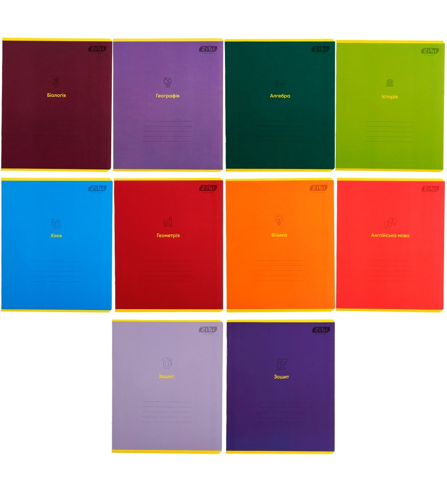 Набір зошитів учнівських шкільних серії "MONOCHROME" від Zibi з лаконічним стильним дизайном обкладинки та блоком корисної довідкової інформації з різних шкільних предметів чудово підходить для виконання класних та домашніх робіт.Набір містить 10 зошитів з 8 предметів: алгебра – 1 шт, геометрія – 1 шт, фізика – 1 шт, хімія – 1 шт, біологія – 1 шт, географія – 1 шт, історія України – 1 шт, англійська мова – 1 шт, зошит шкільний (без довідкової інформації) - 2 шт.Характеристика зошита:36 аркушів розмір виробу 203х167 мм тип скріплення – скоба внутрішній блок: офсетний папір щільністю 55 г/м² білизна паперу 98-100% зошит в клітинку поля червоного кольору заокруглені куточки, що не заминаються обкладинка з целюлозного картону щільністю 190 г/м² з крейдованим шаром, повнокольоровим друком та поліграфічними ефектами: вибірковий УФ лак на внутрішньому боці обкладинки, а також на першому та останньому додатковому аркуші, розміщено довідкову інформацію з предмета (загалом 6 сторінок формул, визначень, понять і правил з предмета).