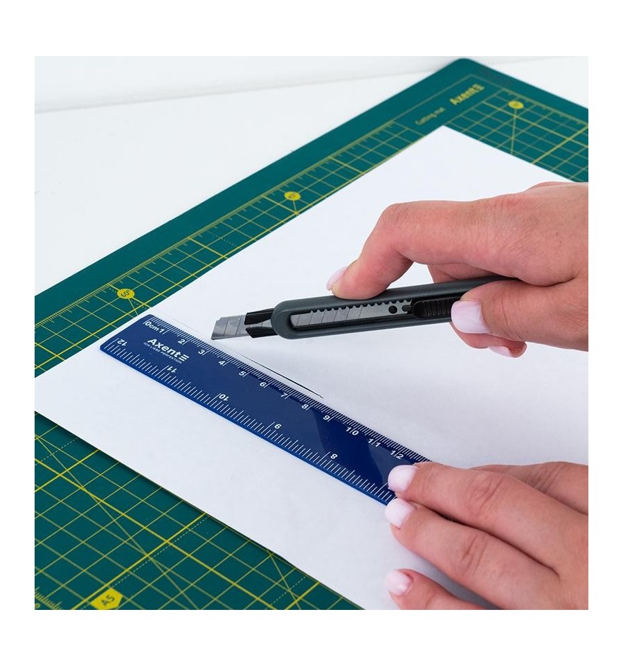 Канцелярський ніж Axent 6605-А з лезом шириною 9 мм та автофіксатором стане незамінним помічником у щоденній роботі з папером, плівкою, картоном або тонким пластиком. Завдяки сучасному дизайну та продуманій ергономіці корпусу, ніж зручно лежить у руці та дозволяє точно контролювати кожен рух.Надійна металева направляюча забезпечує стійкість леза, що особливо важливо для дрібної та акуратної роботи. Механізм автофіксації міцно утримує лезо у потрібному положенні — без додаткових зусиль і ризику мимовільного зсуву під час роботи. Оптимальний варіант для офісу, навчання, рукоділля та побутових потреб. Компактний розмір та легка вага роблять цю модель зручною для щоденного використання. Стриманий чорний колір додає ножу універсальності та виглядає стильно в будь-якому робочому середовищі.Особливості:сталеве багатосекційне лезо шириною 9 мм; металева направляюча; автоматична фіксація; механізм ступінчастої подачі леза; ергономічний корпус із міцного пластику; стильний стриманий дизайн.