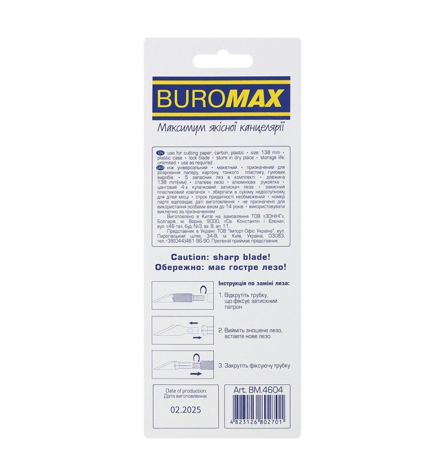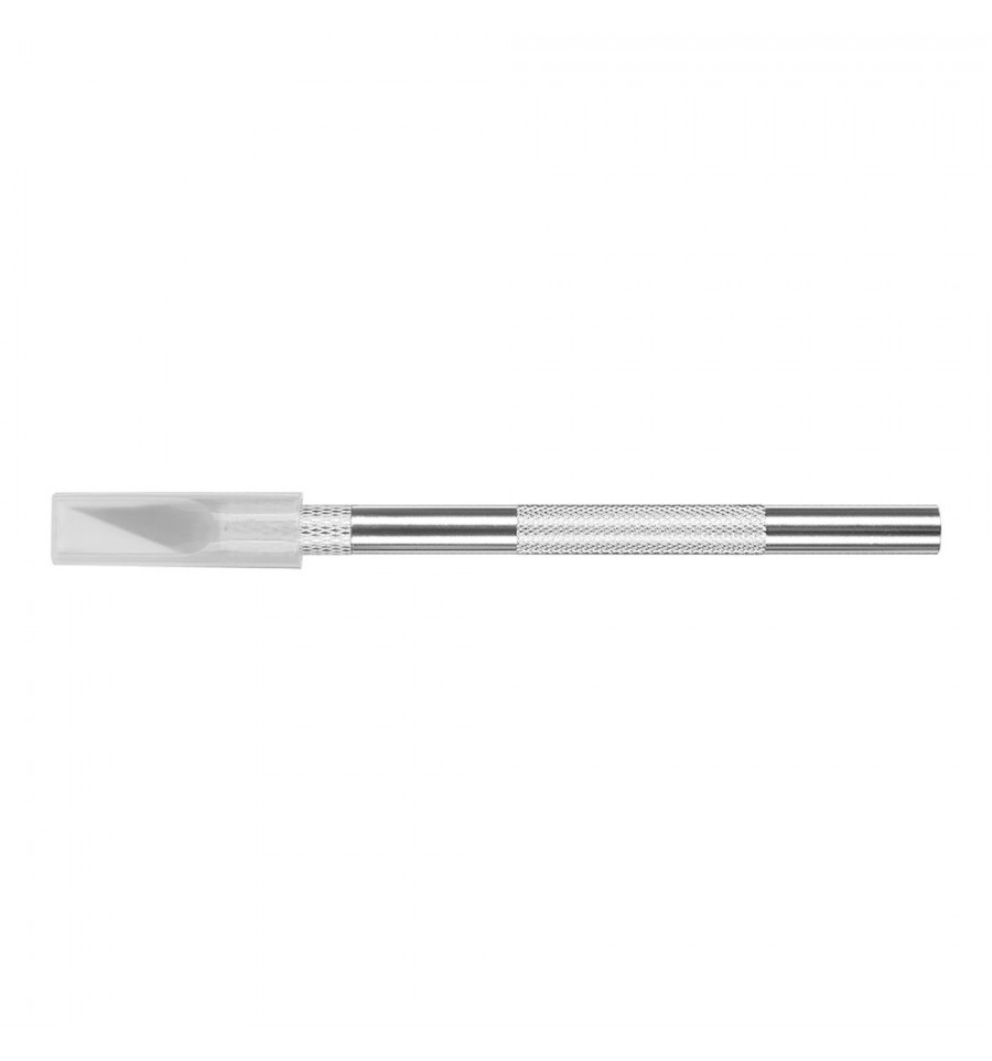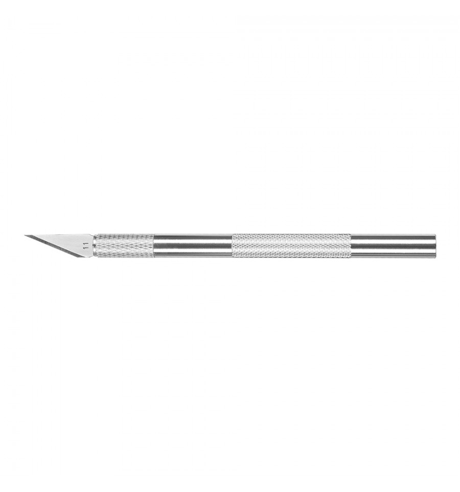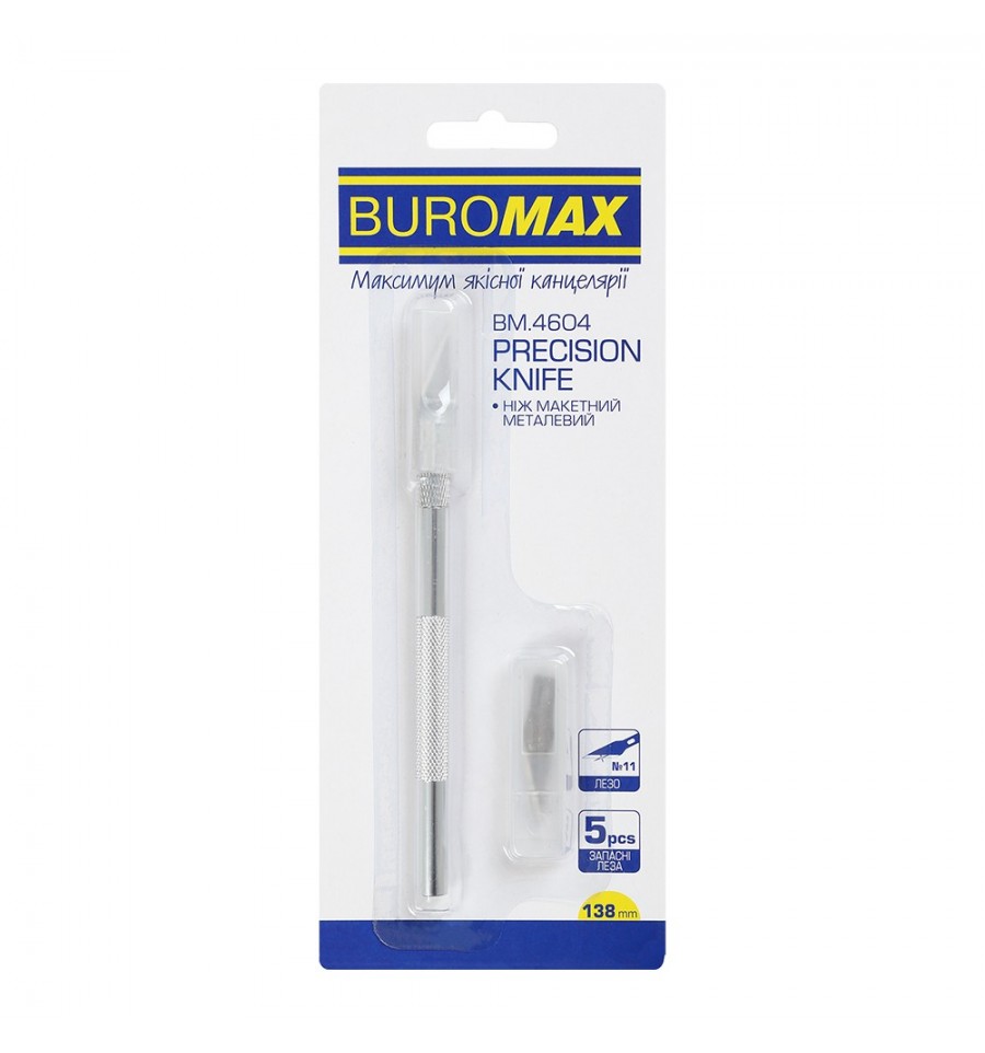 Металевий макетний ніж від BUROMAX призначений для точного та акуратного різання паперу, картону, плівки, шкіри, пластику та інших тонких матеріалів. Його застосовують в архітектурному моделюванні, графічному та промисловому дизайні, для рукоділля, скрапбукінгу, при роботі з шкіряними виробами та виробами з гуми, при дрібному ремонті, в побуті для створення макетів, шаблонів, інтер'єрних прикрас та інших декоративних елементів або викрійок.довжина виробу 138 мм міцне лезо № 11 у формі скальпеля, виготовлене з нержавіючої сталі цанговий 4-х кулачковий затискач забезпечує надійну нерухому фіксацію леза та легку його заміну алюмінієва легка та зручна (має антиковзаюче рифлення) ручка круглої форми в комплекті 5 запасних лез має захисний пластиковий ковпачок на лезі