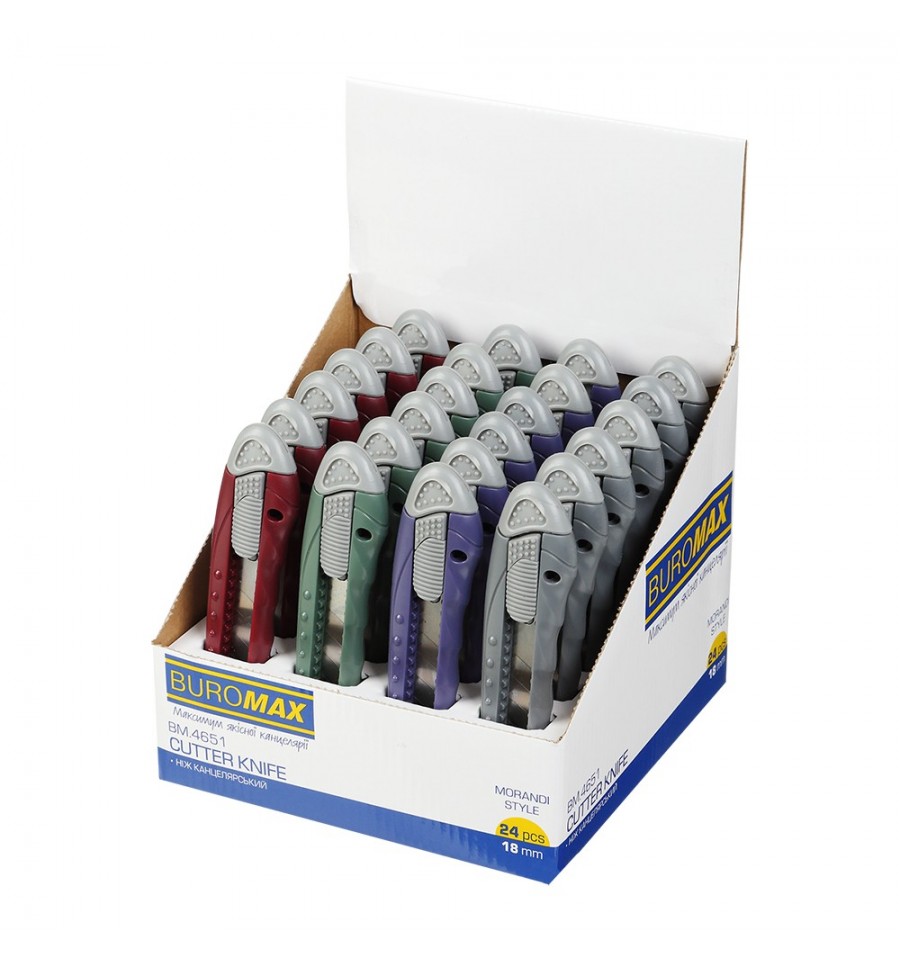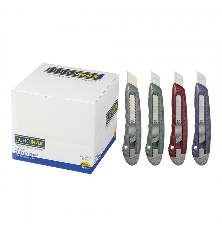 Канцелярський ніж MORANDI STYLE від BUROMAX- офісний інструмент для різання паперу, тонкого пластику та інших нещільних матеріалів.ширина леза – 18 мм розмір ножа: 150х30х15 мм пластиковий корпус стійкий до механічних пошкоджень лезо виготовлене з нержавіючої сталі надійний механізмом фіксації леза забезпечує його нерухомість під час роботи оснащений знімною заглушкою з насічкою на рукоятці - для легкого облому зношеного сегмента леза змінні леза – BM.4691 кольори: синій, сірий, зелений, бордовий групова упаковка: картонний шоу-бокс містить 24 шт. в асорті кольорах