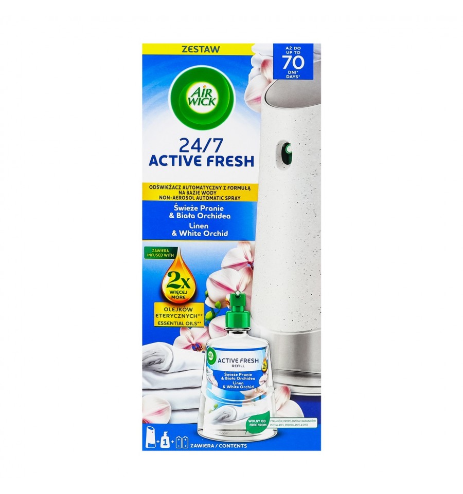 Освіжувач повітря Air Wick Active fresh Ранкова свіжість та квіти орхідеї автоматичний 228мл. Склад: ароматизатор, вода, етиловий спирт денатурований, піногасник. Застереження/міри безпеки: завжди направляйте пристрій в протилежний від обличчя бік перед увімкненням. Увага: уважно прочитайте запобіжні заходи та застереження перед використанням. Збережіть інструкцію для майбутнього використання. Лише для застосування дорослими. Не використовувати дітям та особам з обмеженими фізичними, сенсорними або розумовими можливостями. Увага: використовувати лише за призначенням. Зберігати та використовувати у місці, недоступному для дітей та тварин. Використовуйте тільки в добре провітрюваних приміщеннях. Перед тим, як вставити флакон, переконайтесь, що вимикач автоматичного пристрою знаходиться в положенні OFF. Прочитайте та дотримуйтесь запобіжних заходів щодо використання на змінному флаконі. Використовуйте змінний флакон лише з автоматичним освіжувачем Air Wick. Розташуйте пристрій на висоті щонайменше 2 метри від підлоги. Використовувати лише лужні батарейки. Переконайтеся, що батарейка вставлена правильно, відповідно до позначень (+) та (-). Якщо батарейка тече, негайно вийміть її і видаліть залишки рідини. Вийміть батарейку, якщо пристрій довго не використовується. Якщо Ви залишаєте будинок більш, ніж на тиждень, вимкніть пристрій. Не встановлювати і не залишати поблизу джерел тепла, відкритого вогню та електричного устаткування, під прямими сонячними променями (нагрівання вище 50°С). Бережіть батарейки від води, вогню і дії високих температур. Викликає коротке замикання. Не намагайтеся перезарядити батарейку. Утилізувати згідно вимог чинного законодавства. Вийміть батарейку. Порожній флакон може бути утилізований або перероблений. Утилізовувати прилад в місцях для утилізації даних відходів. Увага: використовувати лише за призначенням. Свідоме неправильне використання шляхом навмисного збільшення концентрації та вдихання вмісту може бути шкідливим чи мати фатальні наслідки. Використовуйте тільки в добре провітрюваних приміщеннях. Слизький на твердих поверхнях. Деякі тверді поверхні можуть стати мокрими після розпилення. У разі контакту з поверхнями негайно протріть вологою тканиною. Не розпилюйте безпосередньо на поверхні, домашніх тварин, підстилку домашніх тварин, їжу або тканини. Продукт містить частини, що можуть стати небезпекою удушення. Підвищення температури може виникнути в автомобілях, а також біля печей та камінів. Люди, які страждають чутливістю до парфумерних ароматів, повинні бути обережні при використанні цього продукту. Освіжувачі повітря не замінюють належні заходи гігієни. Увага. Легкозаймиста рідина та її пара. Зберігати в місці, недоступному для дітей. Якщо потрібна консультація лікаря, майте при собі тару продукту або етикетку. Тримати подалі від тепла, гарячих поверхонь, іскор, відкритого полум`я та інших джерел запалювання. Не курити. Не розпилювати біля відкритого полум`я та іншого джерела запалювання. Захищати від сонячних променів. Не допускати нагрівання вище 50°С. Утилізувати вміст, упаковку відповідно до національного законодавства. У разі потрапляння в очі: обережно промити водою протягом декількох хвилин. Зняти контактні лінзи, якщо вони використовуються та легко знімаються. Продовжити пр