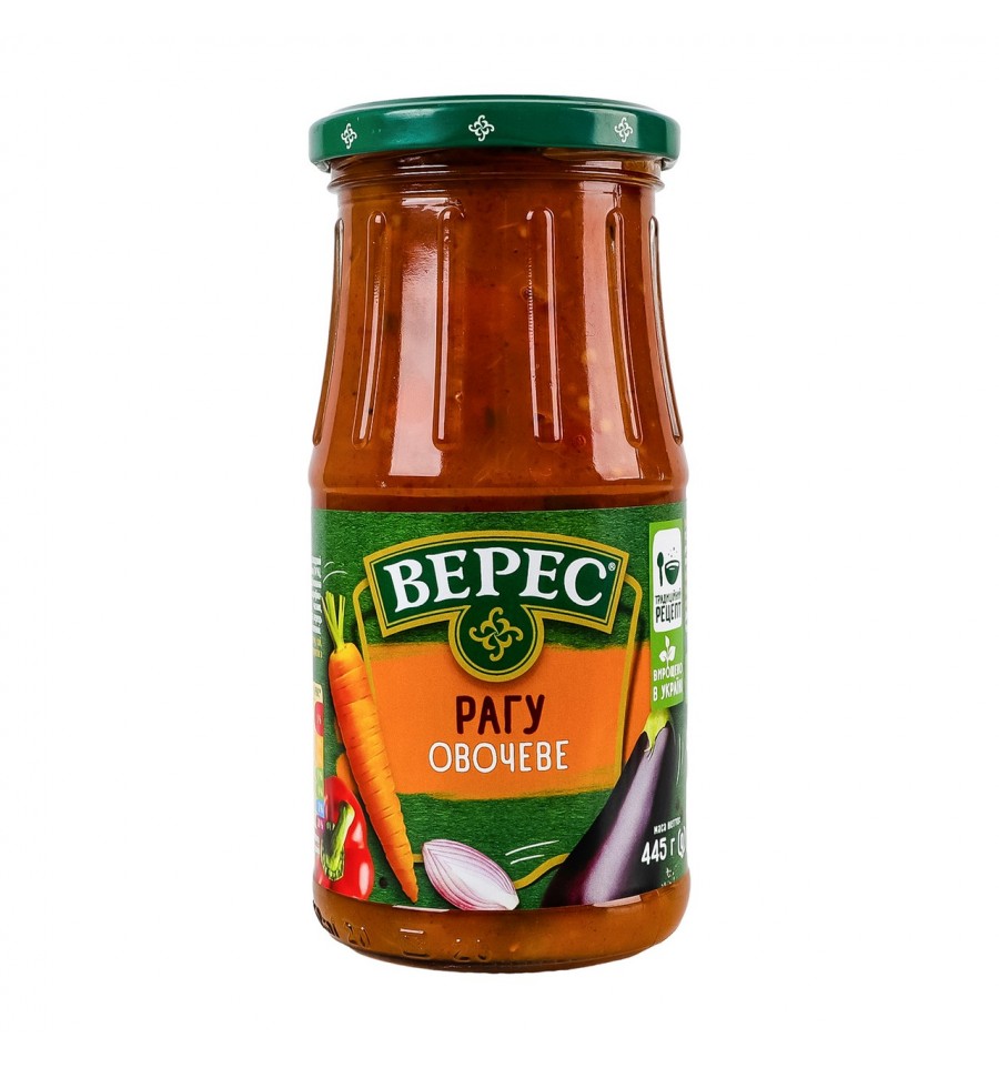 Рагу Верес овочеве стерилізоване 445г. Склад: баклажани (18%), перець солодкий (18%), цибуля (16%), вода питна, морква (14%), паста томатна, олія соняшникова рафінована дезодорована, цукор, сіль кухонна, модифікований крохмаль кукурудзяний, часник, регулятор кислотності оцтова кислота, перець чорний мелений, перець духмяний мелений. Енергетична цінність продукту: 405кДж/100г, 97ккал/100г. Поживна (харчова) цінність продукту: білки - 1г/100г, жири - 5г/100г, насичені жири - 0.6г/100г, вуглеводи - 11.8г/100г, з них цукри - 8г/100г, сіль - 1.2г/100г. Умови зберігання: зберігати за температури 0..+25ºC і відносній вологості повітря не більше 75%. Без потрапляння прямих сонячних променів. Термін придатності: 2 роки. Країна виробник: Україна. Виробник та адреса виробника: ТОВ Віджи Продакшн, вул. Гетьмана Михайла Дорошенка, буд. 1, м. Канів, Черкаський р-н, Черкаська обл., Україна, 19000. Адреса виробничих потужностей: вул. Гетьмана Михайла Дорошенка, буд. 1, м. Канів, Черкаський р-н, Черкаська обл., Україна, 19000. Маса нетто: 445г.