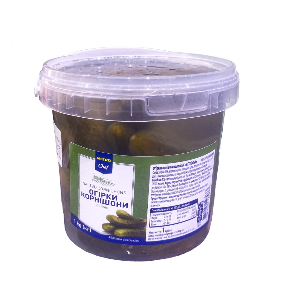 Огірки Metro Chef солоні корнішони 1кг. ТУ У 15.3-35423448-001:2007. Склад: огірки 60%, вода питна, сіль, прянощі та трави.. . Енергетична цінність (калорійність) 100 г продукту — 50 кДж /12 ккал, Жири - 0,1 г, Насичені жири-0 г, Вуглеводи- 2,2г, Цукри-1,5 г, Білки 0,5 г, Сіль 4,0 г. Номер партії ідентифікується за датою вжити до. Зберігати за температури від +0С до +6℃.Після відкриття упаковки продукт зберігати за температури від +0°С до +6℃ не більше 72 год.. Виробник: ТОВ "Таровіта".. Адреса виробника: 08000, Україна, Київська обл., Бучанський р-н, смт Макарів, вул. Банківська, 15а. Адреса потужностей виробництва: 08150, Україна, Київська обл., Фастівський р-н, м. Боярка, вул. Соборності, 36. Тел. +38 067 232 47 78.. Країна: Україна. Маса нетто: 1000 г (g). Маса основного продукту 600 г (g). Допустимий мінусовий відхил від маси нетто не більше 15 г (g)..