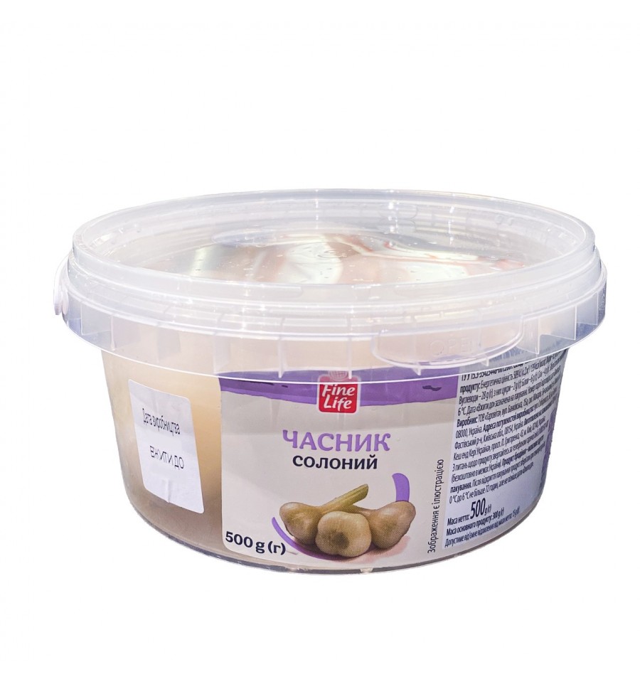 Часник Fine Life солоний 500г. ТУ У 15.3-35423448-001:2007. Склад: часник 60%, вода питна, сіль.. . Енергетична цінність (калорійність) 100 г продукту —589 кДж /139 ккал., Жири — 0,3 г, Насичені жири-0,1 г, Вуглеводи- 28,0г, Цукри-2г, Білки 6,0г, Сіль 4,0 г. Номер партії ідентифікується за датою вжити до. Зберігати за температури від +0С до +6℃.Після відкриття упаковки продукт зберігати за температури від +0°С до +6℃ не більше 72 год.. Виробник: ТОВ "Таровіта".. Адреса виробника: 08000, Україна, Київська обл., Бучанський р-н, смт Макарів, вул. Банківська, 15а. Адреса потужностей виробництва: 08150, Україна, Київська обл., Фастівський р-н, м. Боярка, вул. Соборності, 36. Тел. +38 067 232 47 78.. Країна: Україна. Маса нетто: 500 г (g). Маса основного продукту 300 г (g). Допустимий мінусовий відхил від маси нетто не більше 15 г (g)..