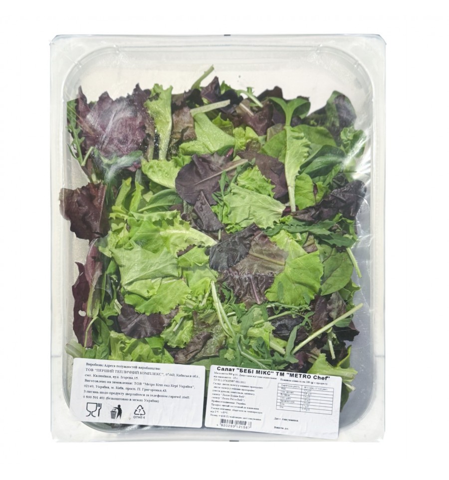 Салат Metro Chef бебі мікс митий 500 г. Упаковка: запакований бокс з закриваючою та відкриваючою етикеткою. Маса нетто 500 г. Допустиме від`ємне відхилення від маси нетто – 15 г. Склад: листя салату у змінних пропорціях (листя руколи, мангольда, шпинату, салату "Лолло Біонда Бебі", салату "Лолло Росса Бебі"). Країна походження: Україна. Продукт митий та готовий до вживання. Умови зберігання: зберігати за температури від 2 ⁰С до 8 ⁰С. Термін придатності 7 діб. Номер партії (L) відповідає даті пакування. Енергетична цінність на 100 г продукту: 88 кДж / 21 ккал, жири – 0,3 г, з них насичені – 0,05 г, вуглеводи – 2,4 г, з них цукри – 1,63 г, харчові волокна – 1,32 г, білки – 2,1 г, сіль – 0,16 г. Виробник: «ПЕРШИЙ ТЕПЛИЧНИЙ КОМПЛЕКС». Адреса виробника: вул. Ігорєва 5, с-ще Калинівка, Броварський р-н, Київська обл., 07443, Україна.