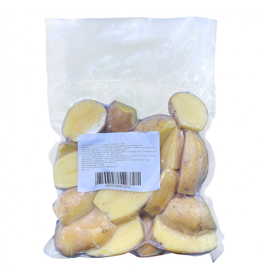Вирощено в Україні. Склад: картопля свіжа мита різана. Пакети з поліетиленової плівки, вакуумована. Потребує термічної обробки. Маса нетто 1000г. Допустиме від’ємне відхилення 1,5 %. Без ГМО. Енергетична цінність (калорійність) та Поживна (харчова) цінність на 100г продукту: 349кДж/83,4ккал, білки - 2г; жири - 0,4г; вуглеводи - 20г. Умови зберігання: температура від 0⁰С до +4⁰С, відносна вологість повітря 85-95%. Термін придатносіт: 14 діб від дати виробництва. Постачальник-виробник: ТОВ «ПОЛТАВА-САД», вул. Сонячна, 1, с.Розсошенці, Полтавський р-н, обл., Україна, 38751, тел.:+38 044 2475. Продукція пройшла контроль за показниками безпеки та не містить пестицидів, нітратів, радіонуклідів та небезпечних карантинних організмів. Номер партії збігається з датою «Вжити до».