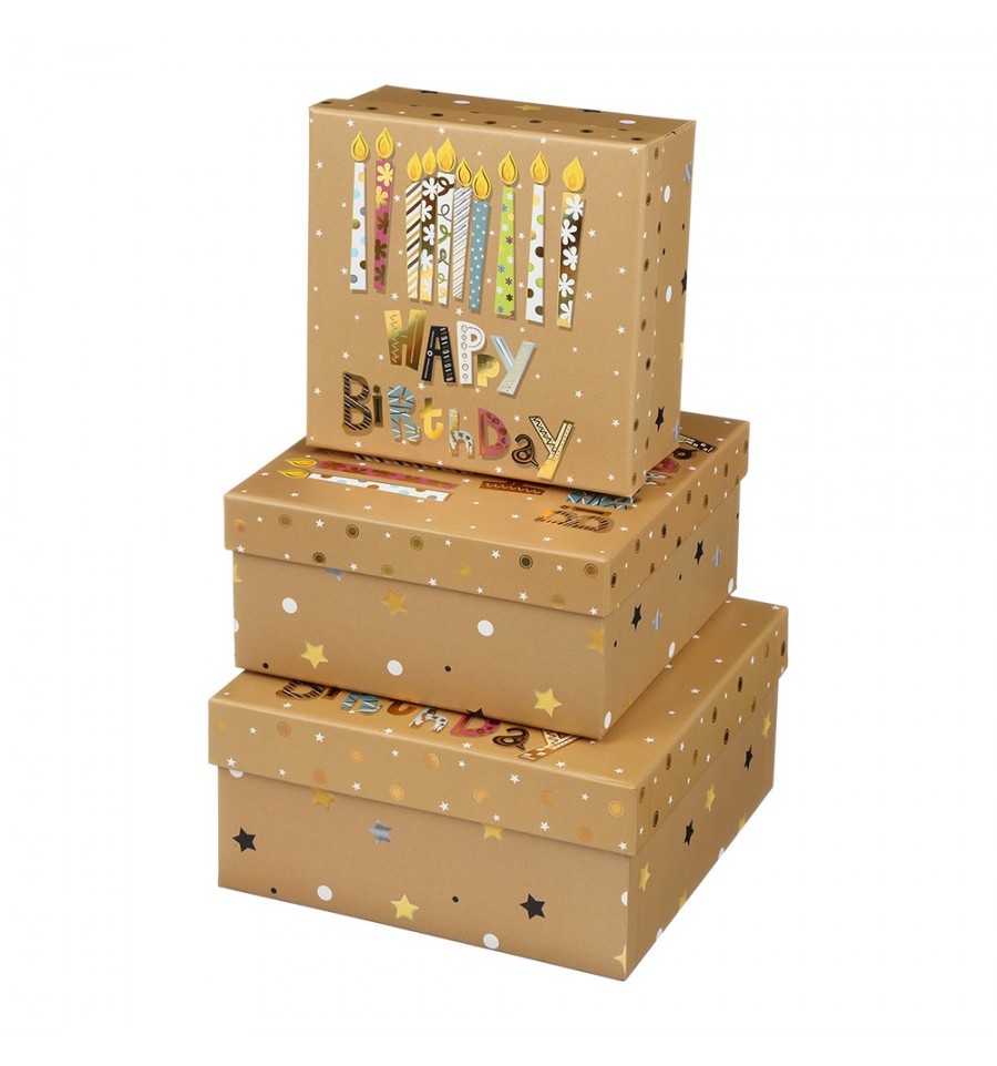 Подарункові коробки від BUROMAX – призначені для упаковування подарунків, сюрпризів, компанування різних предметів в набори. Така упаковка надасть святковості, урочистості, атмосфери та інтриги під час вручення чи дарування та зробить подарунок цілісним і більш привабливим. Упаковка різних подарунків у коробки одного дизайну чи одної серії - це стильно та зі смаком! Такі набори можна використовувати для оформлення інтер'єру до свят та урочистостей.3 коробки в наборі, складаються одна в одну Кришки знімаються Розміри (ШхДхВ): S - 15.5х15.5х7.5 см; M - 18х18х8.5 см; L - 20х20х9.5 см Міцні, виготовлені з дуже цупкого білого картону (щільність 1200 г/м²), витримують велику вагу та навантаження, не зімнуться та якнайкраще захистять подарунок Зовнішня поверхня - папір з повнокольоровим друком (тематика до дня народження) та поліграфічними ефектами: вибіркове тиснення золотою фольгою Всі коробки в одному дизайні