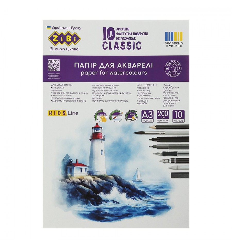 Папір для акварелі серії CLASSIC від ZiBi - підходить для малювання акварельними та гуашевими фарбами, сухою, масляною пастеллю та вугіллям, тушшю, чорнилом, кульковими та гелевими ручками, маркерами та фломастерами. Може використовуватися дітьми та дорослими для створення ескізів, малюнків акварелі, гуаші, пастелі, креслень, орігамі, декору та інших видів творчості.Формат А3 Кількість аркушів: 10 Щільність паперу: 200 г/м² Аркуші вміщені в папку з крейдованого картону щільністю 230 г/м² з повнокольоровим друком Фактурна поверхня аркушів, яка не розмокає, добре вбирає фарбу і дозволяє робити, при необхідності, змивання водою по декілька разів QR-код із переходом на майстер-класи з малювання від ZiBi на кожній обкладинці