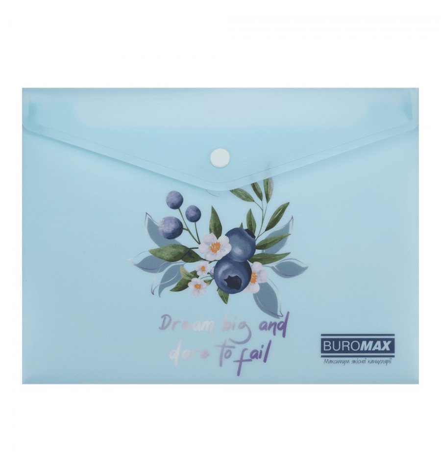 Папка-конверт на кнопці серії ARABESKI від BUROMAX підходить для систематизації, зберігання і транспортування документів. Папка виконана в оригінальному квітковому дизайні неодмінно буде приваблювати і надихати! Така папка підійде для відвідування ділових зустрічей, транспортування та зберігання паперів, навчальних матеріалів, посібників та багато іншого. Папка стане в нагоді співробітникам офісних і бізнес центрів, фінансових відділів і установ, студентам і школярам, захистить вміст від зминання, намокання чи забруднення.для паперів формату А5 (розмір 180х240 мм) матеріал: матовий напівпрозорий пластик товщиною 180 мкм закривається клапаном за допомогою пластикової кнопки, що забезпечує надійне збереження паперів та легкий доступ до них місткість до 150 аркушів основний колір: чароіт Придбайте інші канцтовари серії ARABESKI, з квітковими та пастельними дизайнами і зберіть власну унікальну колекцію, яка неодмінно підкреслить Ваш стиль та смак і обов'язково буде радувати погляд!