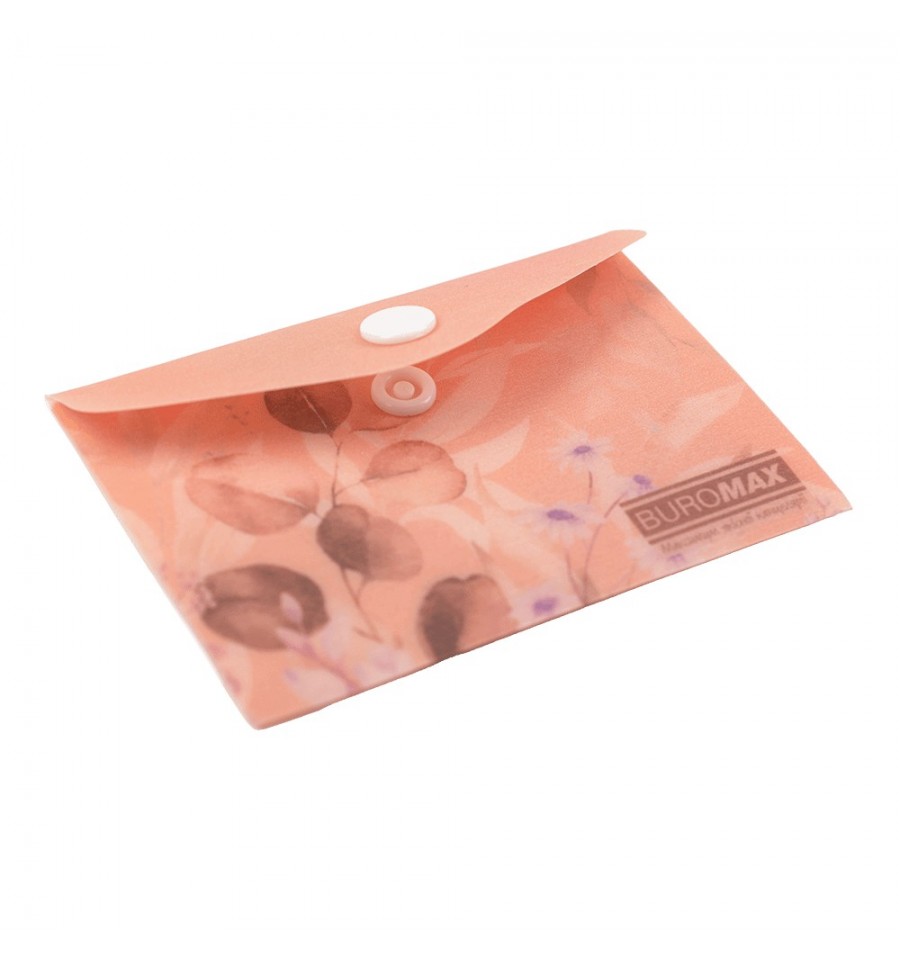 Папка-конверт на кнопці серії ARABESKI від BUROMAX підходить для зберігання і транспортування візиток, пластикових карт, перепусток чи проїздних квитків Папка виконана в стильному квітковому дизайні з блиском, що іскриться на світлі, неодмінно буде приваблювати і надихати! Папка стане в нагоді співробітникам офісних і бізнес центрів, студентам і школярам, захистить вміст від зминання, намокання чи забруднення.під формат А7 (розмір 74х105 мм) матеріал: матовий напівпрозорий пластик товщиною 180 мкм закривається клапаном за допомогою пластикової кнопки, що забезпечує надійне збереження вкладених предметів та легкий доступ до них основний колір: персиковий Придбайте інші канцтовари серії ARABESKI, з квітковими та пастельними дизайнами і зберіть власну унікальну колекцію, яка неодмінно підкреслить Ваш стиль та смак і обов'язково буде радувати погляд!