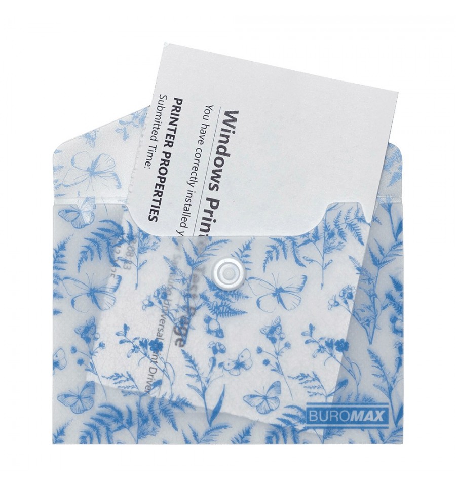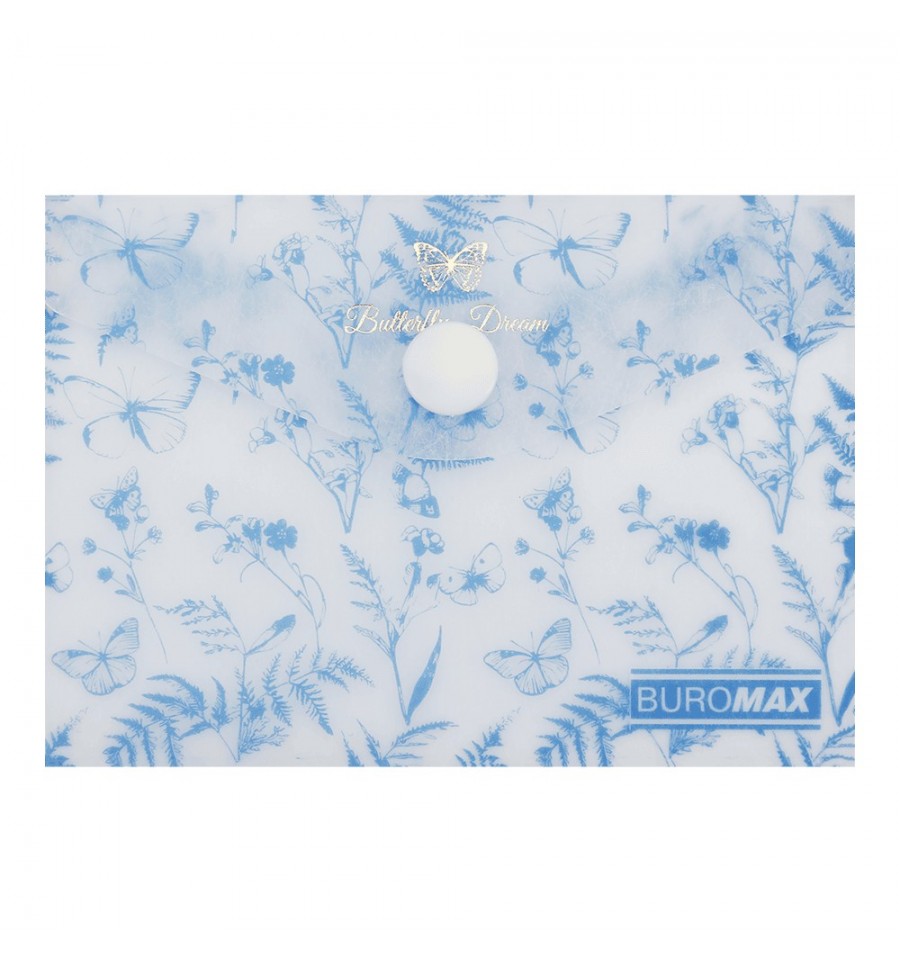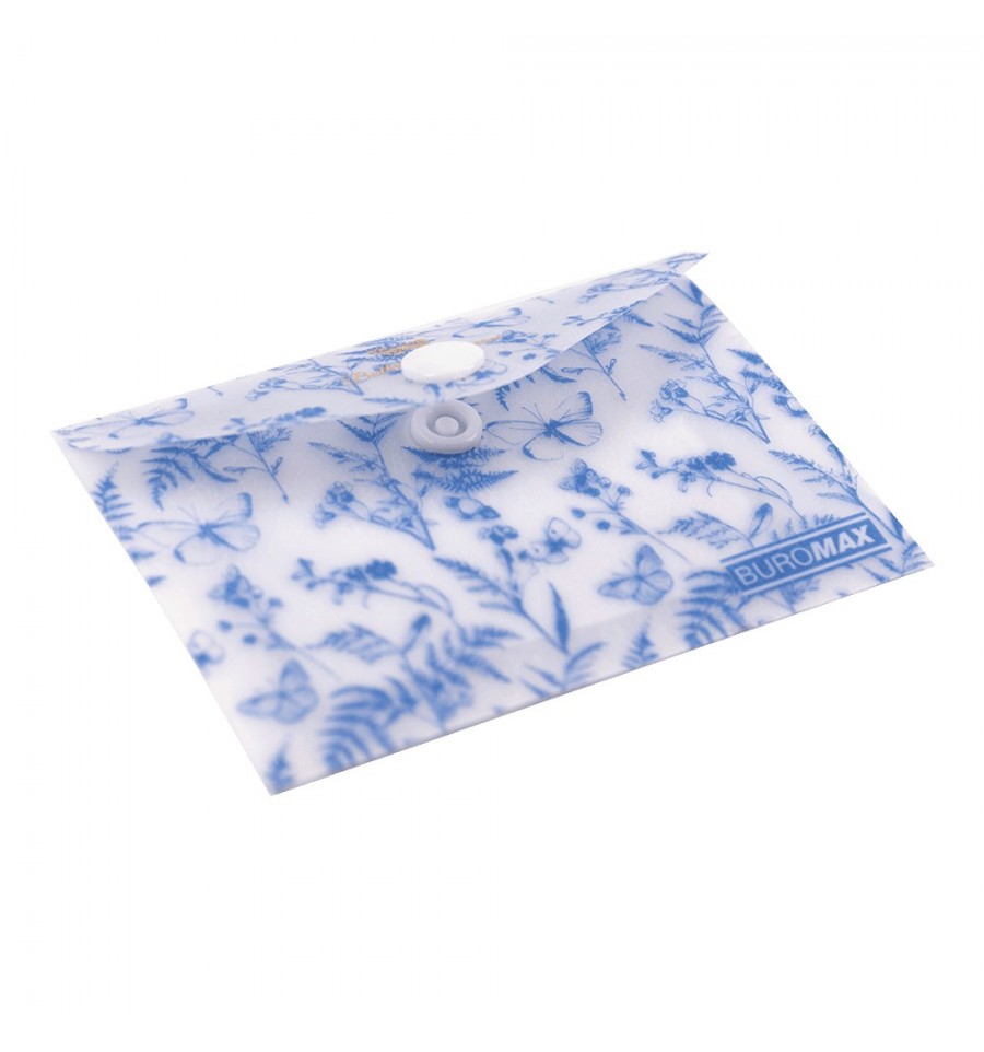 Папка-конверт на кнопці серії ARABESKI від BUROMAX підходить для зберігання і транспортування візиток, пластикових карт, перепусток чи проїздних квитків Папка виконана в ніжному квітковому дизайні з вишуканим золотим фольгуванням, неодмінно буде приваблювати і надихати! Папка стане в нагоді співробітникам офісних і бізнес центрів, студентам і школярам, захистить вміст від зминання, намокання чи забруднення.під формат А7 (розмір 74х105 мм) матеріал: матовий напівпрозорий пластик товщиною 180 мкм закривається клапаном за допомогою пластикової кнопки, що забезпечує надійне збереження вкладених предметів та легкий доступ до них основний колір: блакитний Придбайте інші канцтовари серії ARABESKI, з квітковими та пастельними дизайнами і зберіть власну унікальну колекцію, яка неодмінно підкреслить Ваш стиль та смак і обов'язково буде радувати погляд!