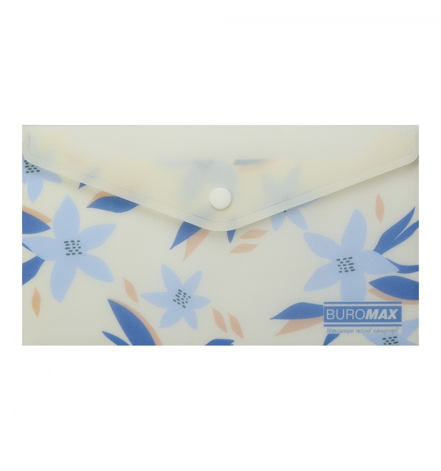Папка-конверт євроформату DL на кнопці серії ARABESKI від BUROMAX підходить для зберігання і транспортування документів, має зручний формат для подорожей. Папка виконана в ніжному квітковому дизайні, що неодмінно буде приваблювати і надихати! Папка найкраще стане в нагоді співробітникам туристичних та рекламних агенцій та компаній, гідам та маркетологам, та багатоьм іншим споживачам, захистить вміст від зминання, намокання чи забруднення.для паперів формату DL (розмір 225х125 мм) матеріал: матовий напівпрозорий пластик товщиною 180 мкм закривається клапаном за допомогою пластикової кнопки, що забезпечує надійне збереження паперів та легкий доступ до них може використовуватися як пенал, для зберігання дрібного канцелярського приладдя основний колір: маренго Придбайте інші канцтовари серії ARABESKI, з квітковими та пастельними дизайнами і зберіть власну унікальну колекцію, яка неодмінно підкреслить Ваш стиль та смак і обов'язково буде радувати погляд!